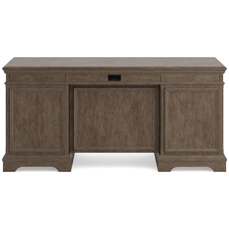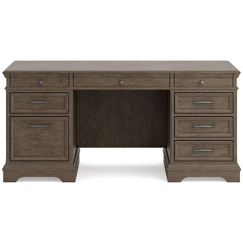 - OverviewMake a style statement with the Janismore home office desk by Signature Design. Its traditional design is updated with an on trend weathered gray finish and wire-brushed texture. The desk’s seven storage drawers and single file drawer add up to a well-organized workspace.