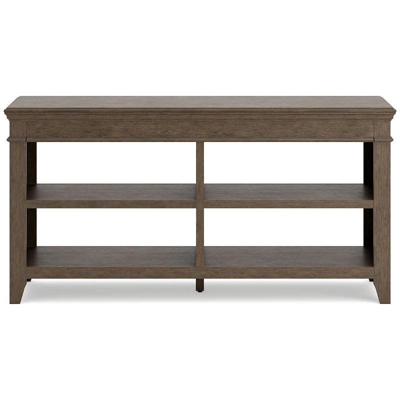 - OverviewMake a style statement with this Janismore home office credenza by Signature Design. Its traditional design is updated with an on-trend weathered gray finish and wire-brushed texture. The credenza’s open storage and adjustable shelving add up to a well-organized workspace.