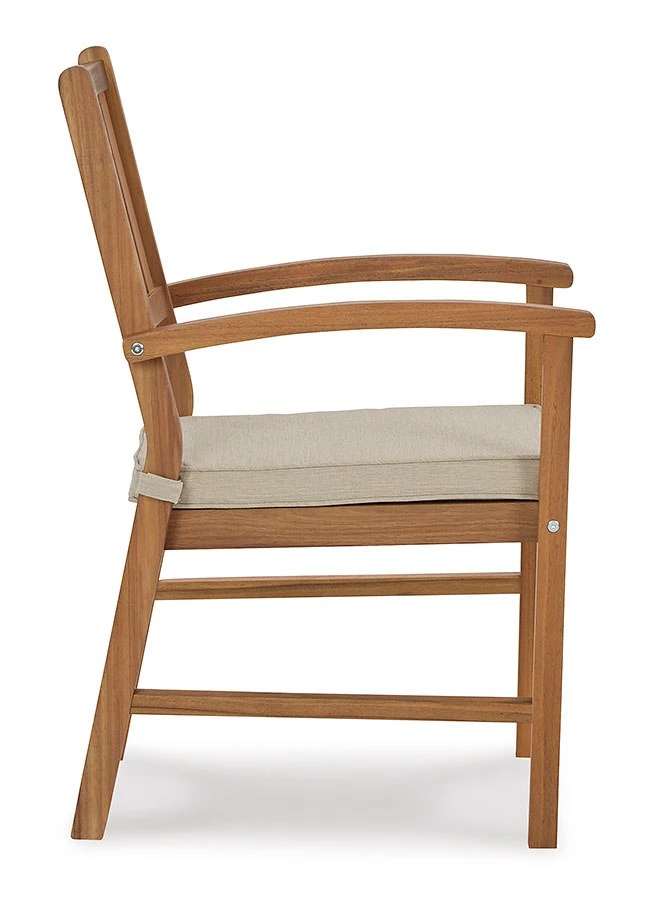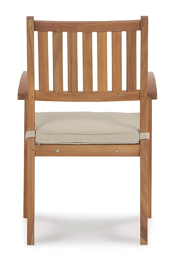 - OverviewThere’s no need to be stuck inside when the weather is perfect. Enjoy an alfresco gathering with this Janiyah outdoor arm chair and cushion set by Signature Design. Made of solid acacia wood, this chair set is built to keep its looks with a slatted seat that sheds rainwater and weather-friendly cushions covered in Nuvella high-performance fabric. You’ll love soaking in the scenery from here.
