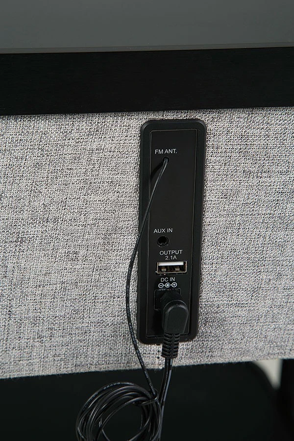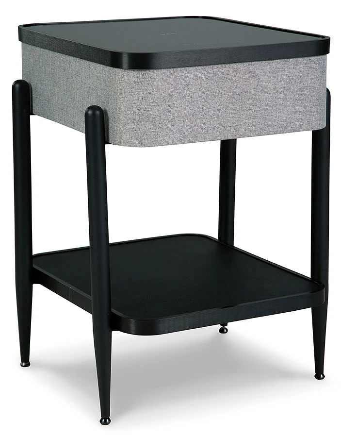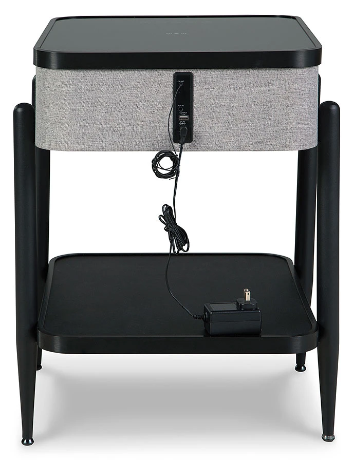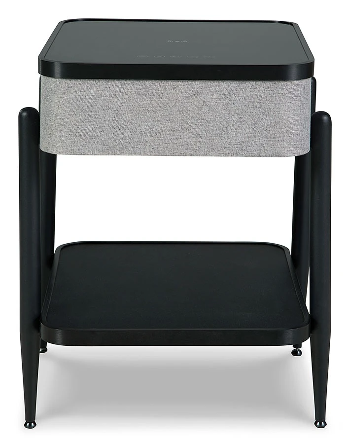 - OverviewIf you’re a fan of sleek, space-saving design, this Jorvalee Accent Table by Signature Design will be music to your ears. In tune with your lifestyle, it features an integrated speaker that connects wirelessly to your favorite songs. Its glass top (with wireless charging and touch-button controls) harmonizes perfectly with neutral gray fabric on the sides. This contemporary table hits all the right notes for form and functionality.