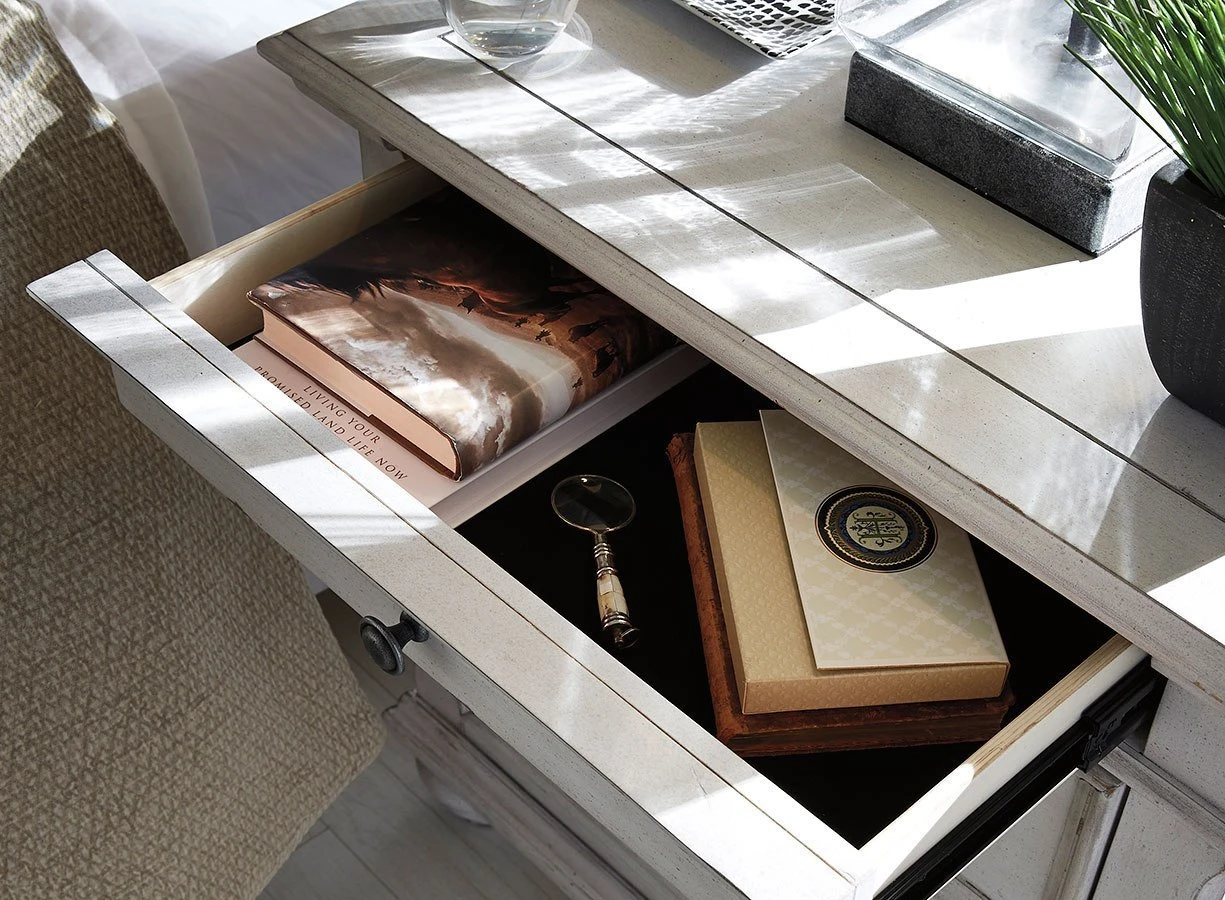 - OverviewGive your retreat vintage charm and valuable drawer storage with the Kanwyn Bedroom Collection by BenchCraft. In a beautifully distressed whitewashed finish, you’ll love putting it all away in casual style. The full-sized drawers and accessory top drawers will easily accommodate your needs. Generously scaled moulding from top to bottom, along with bun feet and drawer handles with a transitional aesthetic, give this collection character – invoking the feel of a quaint cottage escape.