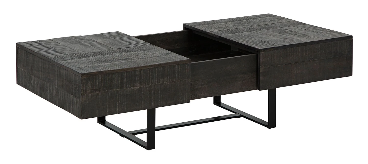 - OverviewThis Kevmart Coffee Table by Signature Design has a mixed-material look that seamlessly slips into any contemporary scene. Its planked top, with a saw mark effect and grayish brown glaze, impresses with its raw beauty. A sleek black metal base provides visual balance. The table’s top sides open to reveal a large compartment, granting you subtle storage and superior style all in one.