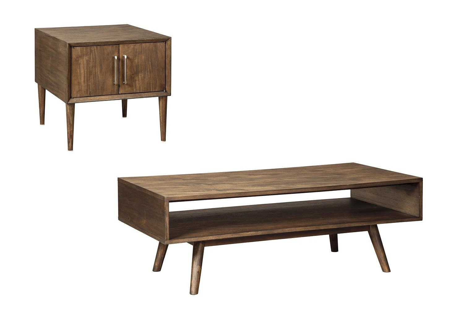 - OverviewThe Kisper Occasional Table Set by Signature Design is made with Acacia veneers and solids in a brushed dry brown finish. Cocktail table has storage shelf. End table has door storage that is accented with aged pewter color bar pulls.