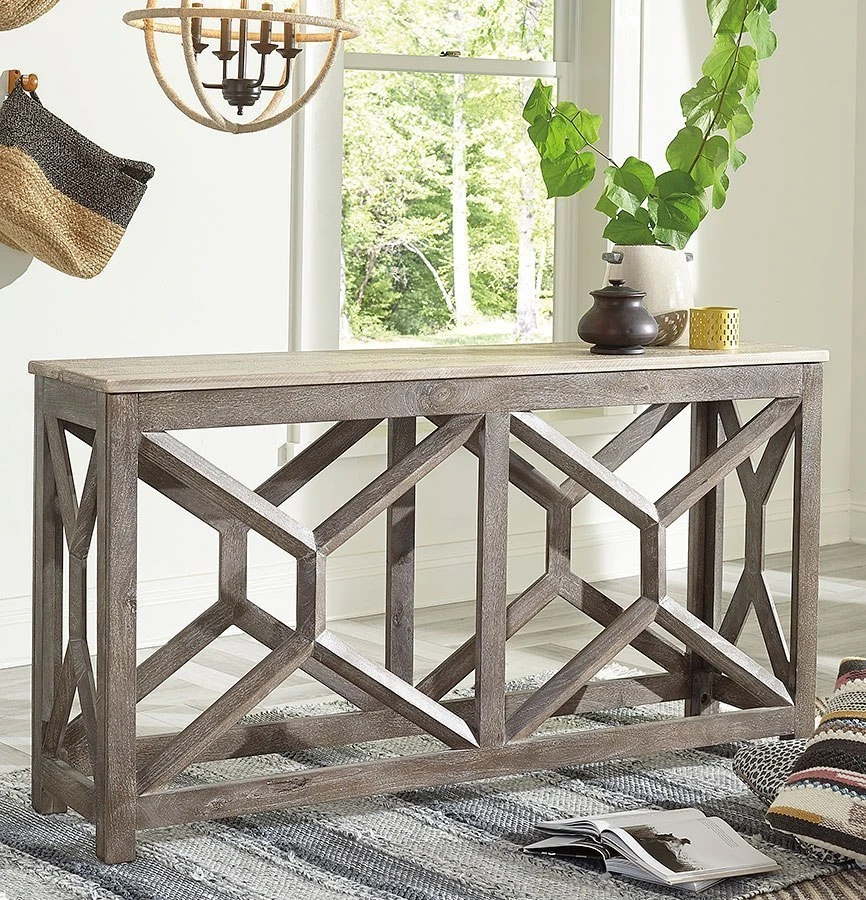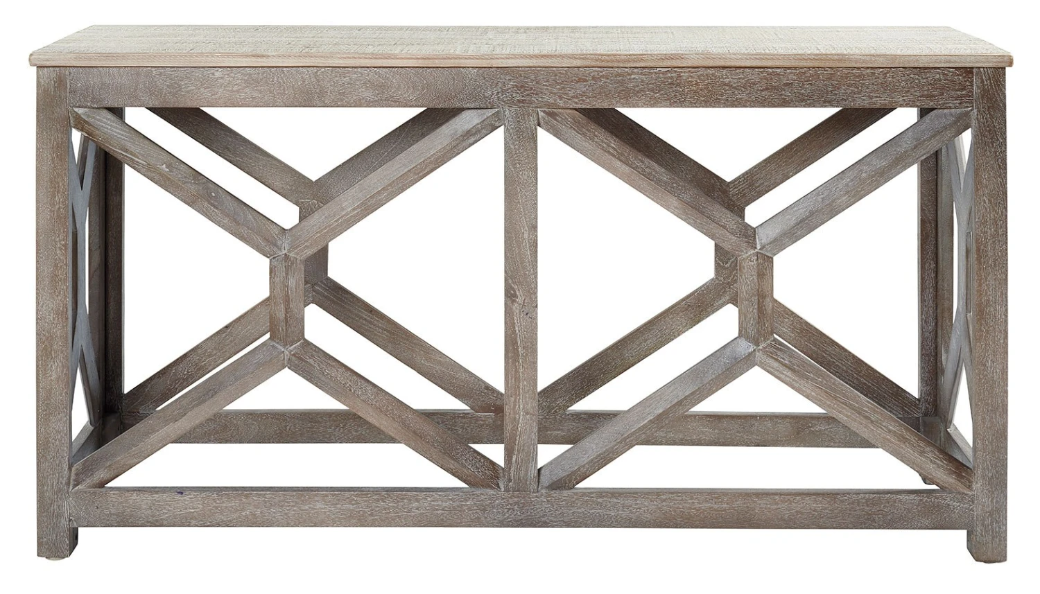 - OverviewMerging a highly modern profile with a two-tone, timeworn finish, this console sofa table is a prime case of opposites attract. The chic, sculptural base of this solid wood table is enriched with an antique gray finish. Topping the table off with a whitewash aesthetic makes things twice as interesting.