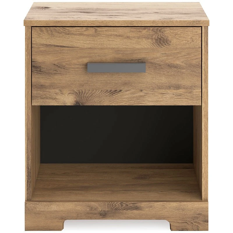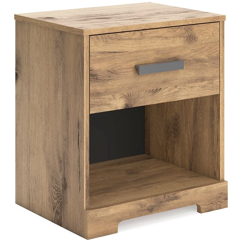 - OverviewSimply stunning in its versatility, this Larstin nightstand by Signature Design takes a relaxed approach to rustic style. Its golden finish has a universal appeal that’s oh-so inviting. Matte black hardware and an open cubby ground the look with a hint of modern flair and function. Whether it’s in a guest room or kids bedroom, this warm and welcoming piece complements a variety of settings.