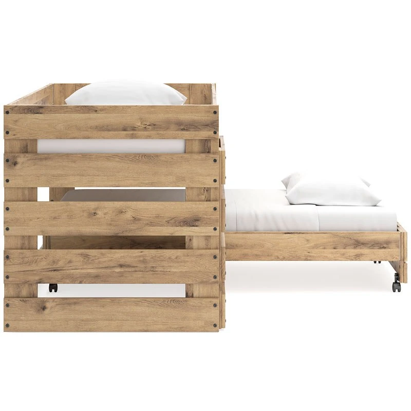 - OverviewSimply stunning in its versatility, this Larstin Twin over Twin Loft Bed by Signature Design takes a relaxed approach to rustic style. Its golden finish has a universal appeal that’s oh-so inviting. The lofted design leaves space to slide the twin caster bed underneath whenever you need it, grounding the look with a hint of modern flair and function. Whether it’s in a guest room or kids bedroom, this warm and welcoming piece complements a variety of settings.