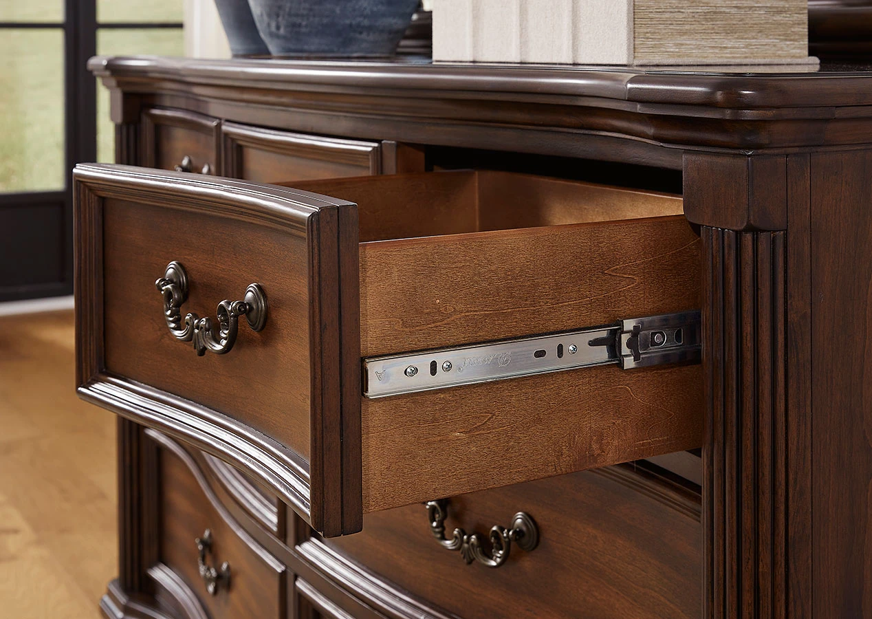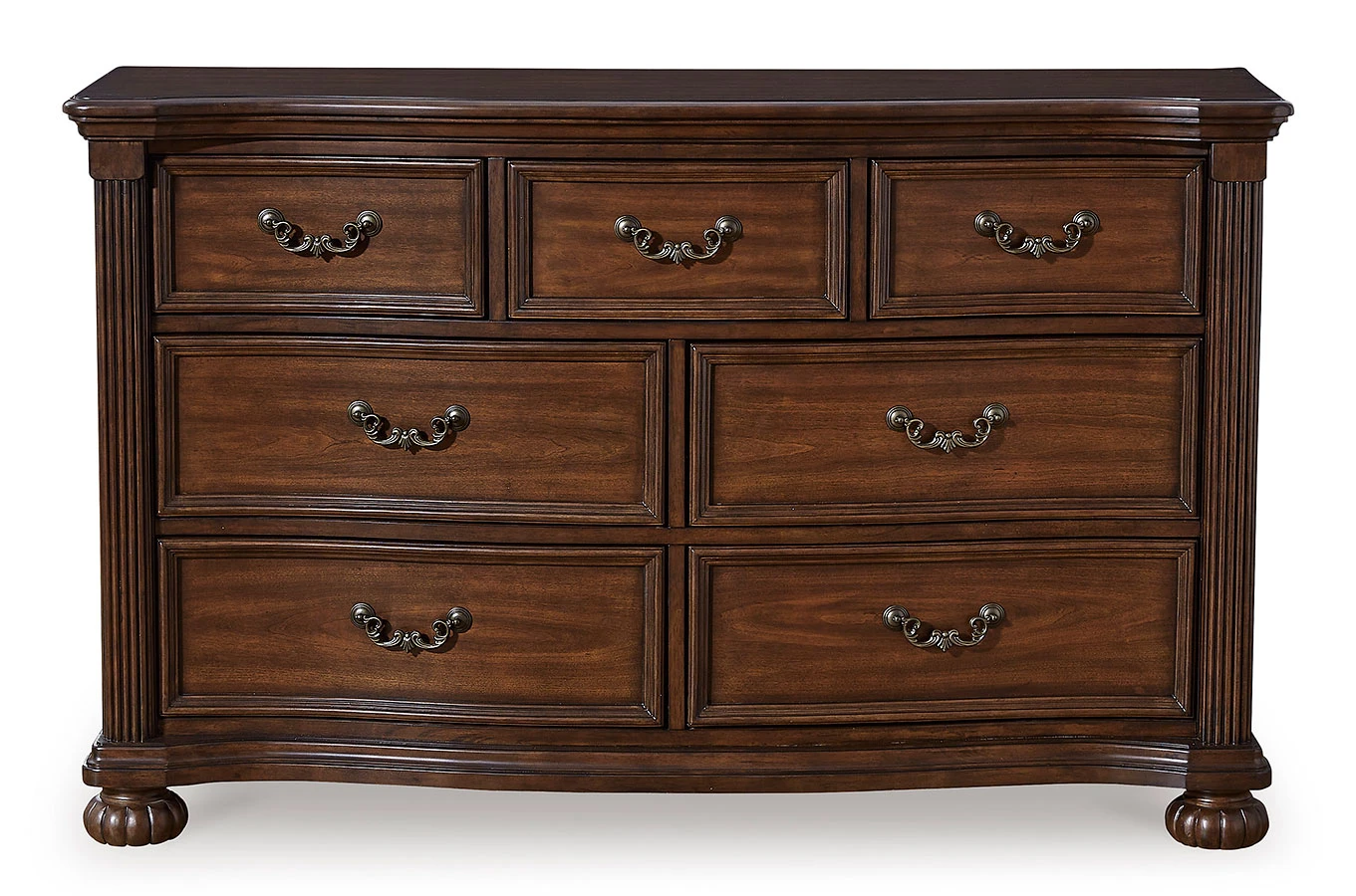 - OverviewTake inspiration from the traditional luxury of this Lavinton Dresser by Signature Design. Classic with a rich cherry brown finish, its stately presence graces your room with an air of opulence. Your taste for exquisite details is satisfied with decorative drawer pulls and chic bun feet. With seven drawers acting as elegant hosts for clothes and other essentials, your restful retreat has never been so refined.