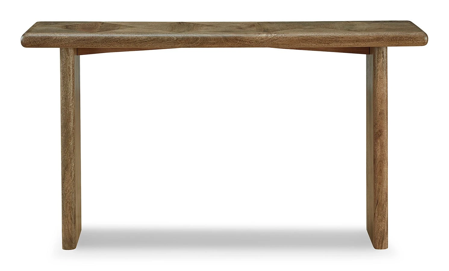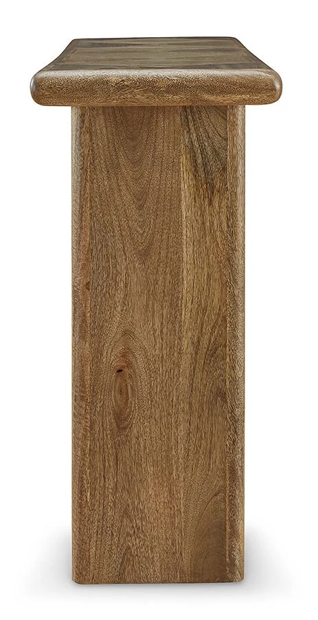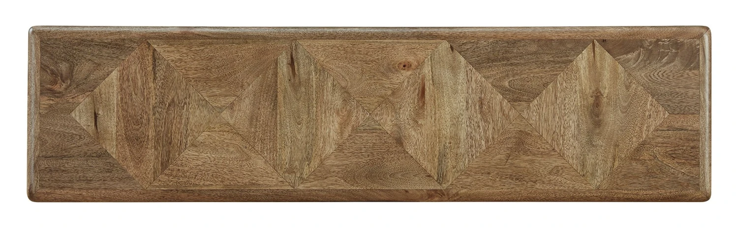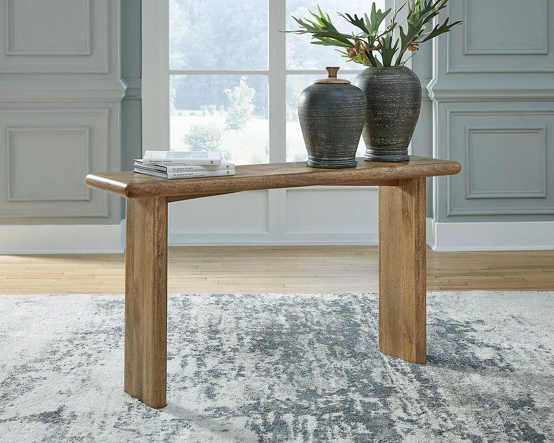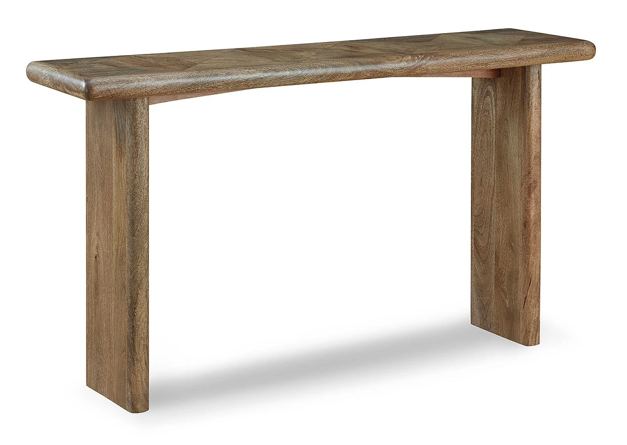 - OverviewCraft a contemporary hideaway of your very own with the simple-yet-compelling design of this Lawland sofa table by Signature Design. Dress it up with decor, or keep it bare to showcase the top’s dynamic geometric pattern. Substantial in presence while retaining a streamlined feel, the chunky styling of this piece provides a new take on natural minimalism.