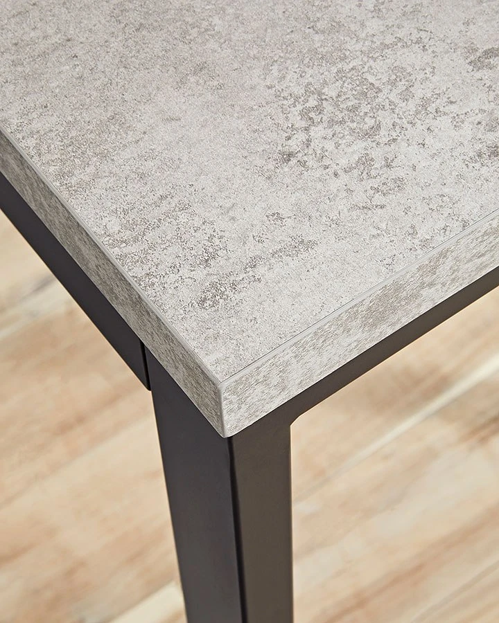 - OverviewCasual linear style is ideal to keep your home office aesthetic appealing and clean. This Lazabon desk by Signature Design features an architectural look with its faux concrete melamine top and a metal base in a dark pewter-tone finish, for the perfect balance of crisp and cool. Melamine is an increasingly popular choice for table surfaces. It can be manufactured to resemble wood grain but with kid-friendly durability.