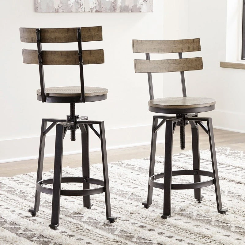- OverviewDelight in the effortless two-tone look of this Lesterton swivel barstool by Signature Design. Dark iron-tone metal and distressed brown wood pair for a rustic look with modern sensibility. A ladderback design brings additional charm. The adjustable height, swivel motion and footrest allow you to find your ideal comfort position.