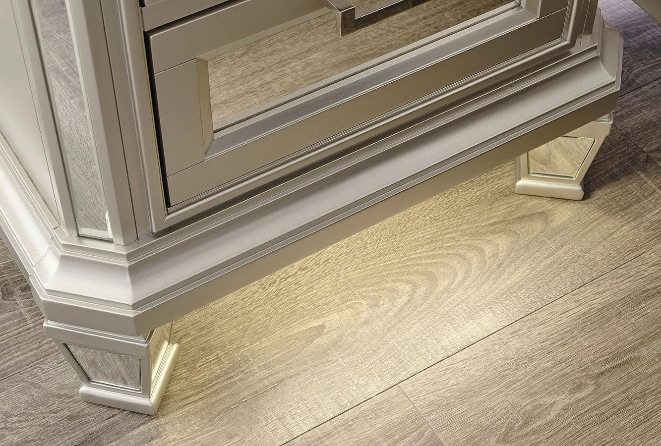 - OverviewThe Lindenfield Bedroom Collection by Signature Design offers contemporary luxe design and is made with solid wood frames, veneer, engineered wood substrates and cast resin components. Metallic silver-tone finish with inset beveled mirror accents. High styled contemporary tufted bed with storage. Drawers feature sanded and sealed drawer boxes with dovetailed construction and metal ball bearing side glides.