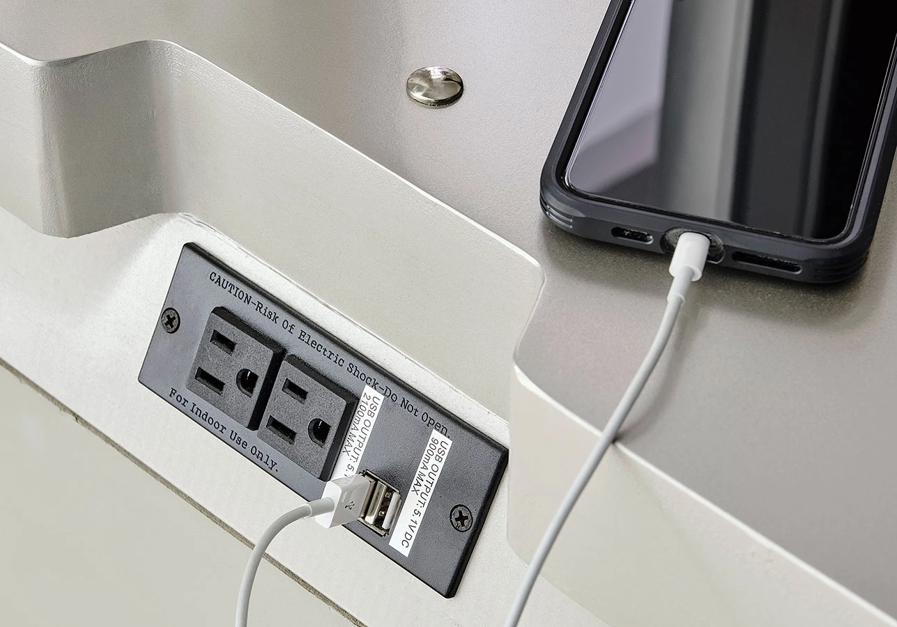 Nightstand features an LED night light and 110V power supply with dual USB charging ports