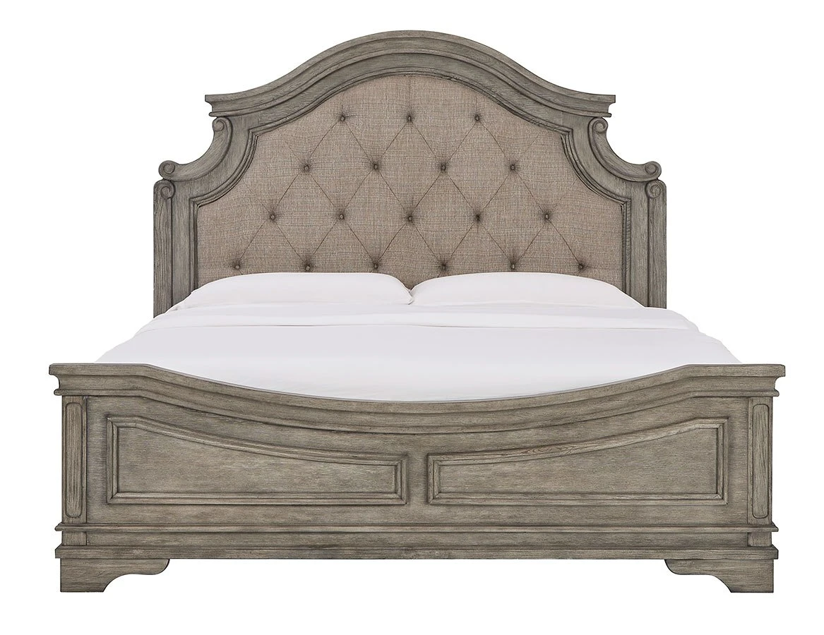 - OverviewCottage quaint styling and quality construction make this Lodenbay Panel Bed by Signature Design a dream come true. An antiqued gray finish and beige upholstery provide rustic warmth. The ornately shaped headboard marries classic design with homey charm for an elegant bedroom must-have.