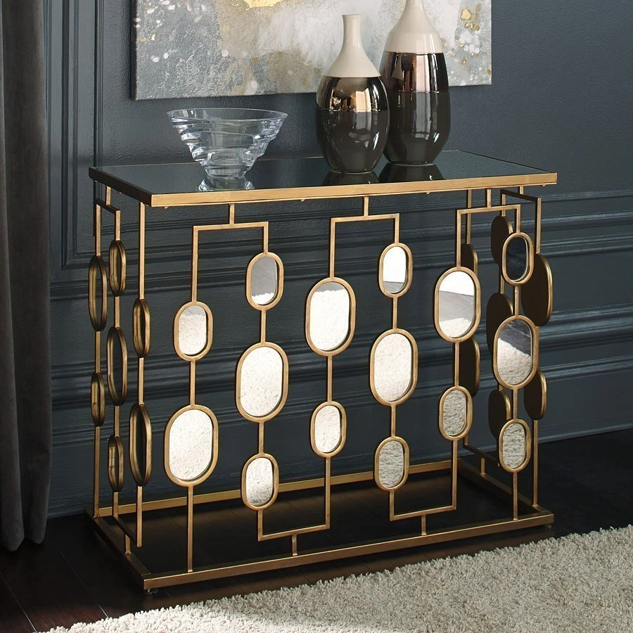 - OverviewLet your sense of high design shine with the Majaci console table. Mirrored glass and a luminous goldtone finish make luxury a part of everyday living. Minimalist-chic styling is sure to open up a space beautifully.