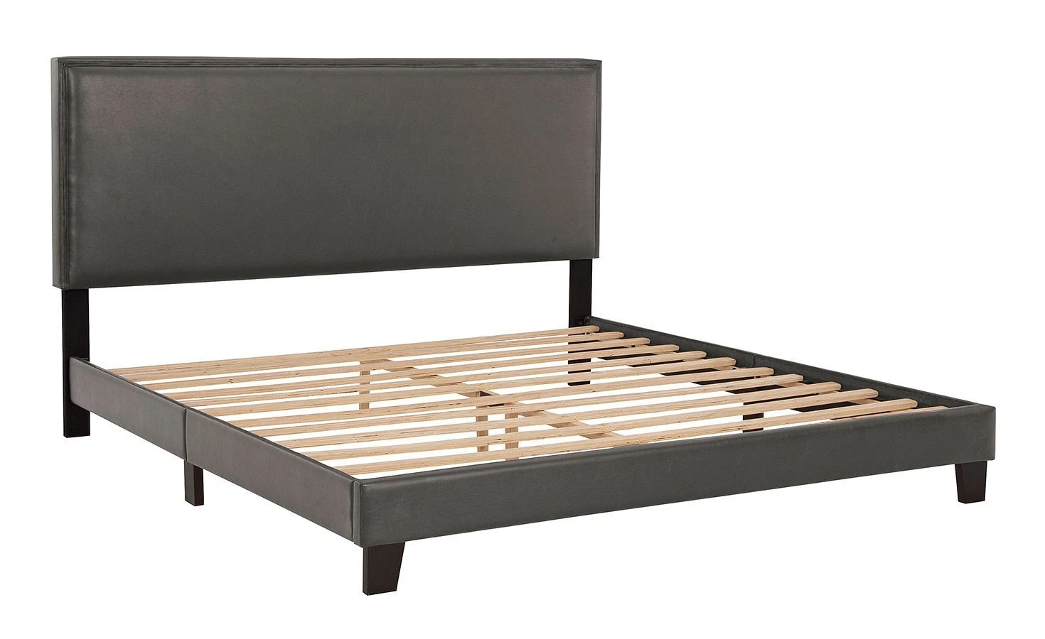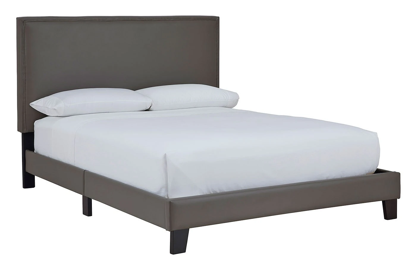 - OverviewAdd a luxe feel to your casual aesthetic with this Mesling Upholstered Bed by Signature Design. Foam-cushioned panels are upholstered in a warm gray faux leather for a sleek, expensive vibe without the high price tag. Best of all, the low-profile slat foundation eliminates the need to purchase an additional box spring.