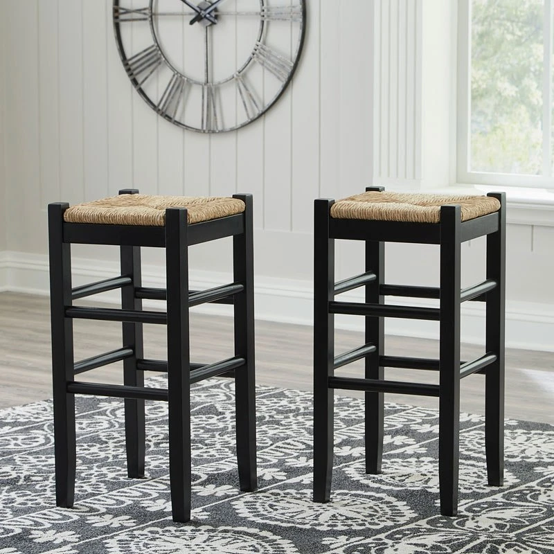 - OverviewBring the vintage casual vibe you love to the kitchen with this Mirimyn bar stool by Signature Design. A stylish seating solution in a chic black finish, this charming stool completes your dining space with ease. The woven synthetic wicker seat and wood stretchers create an effortlessly beautiful look with endless possibilities.