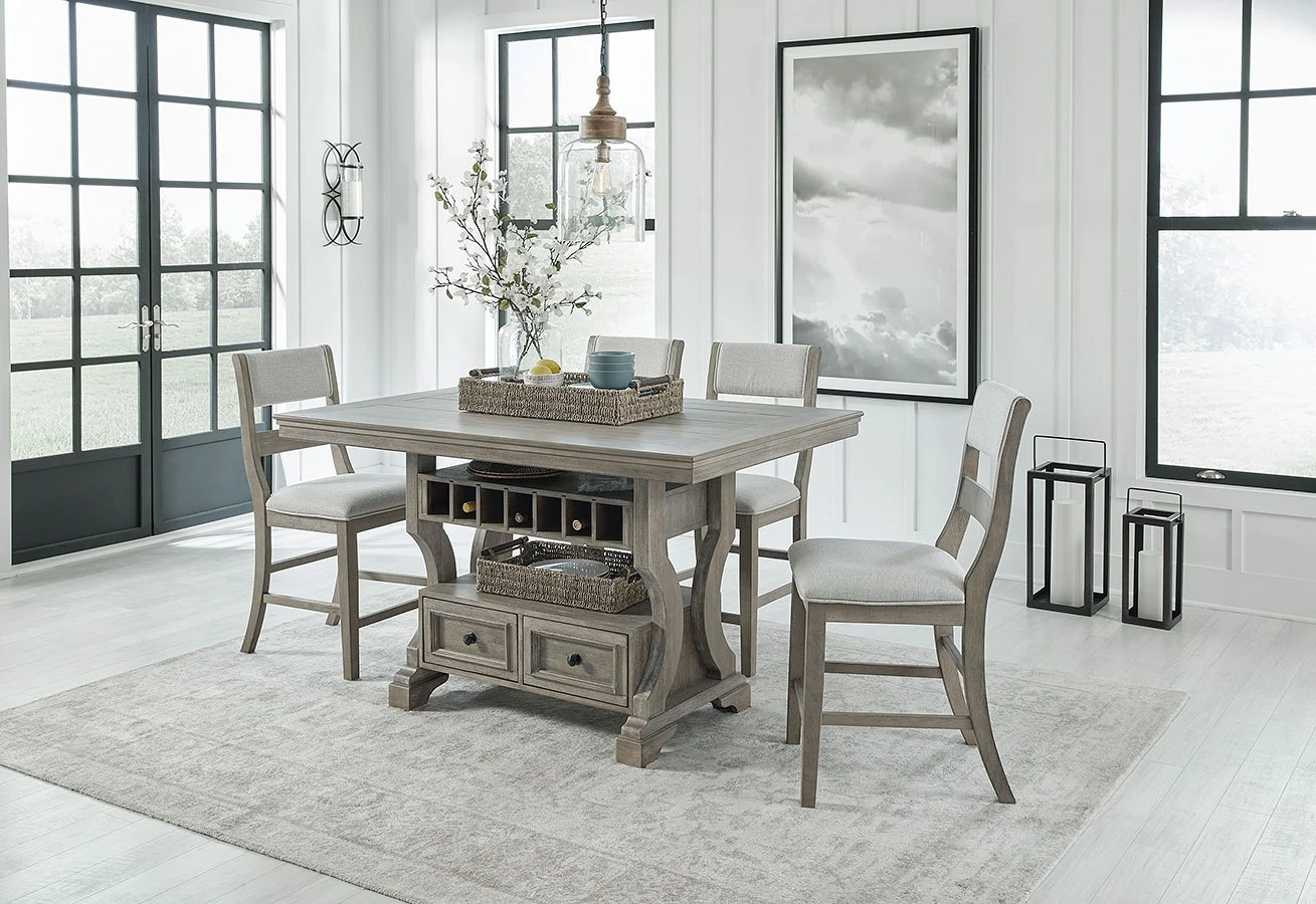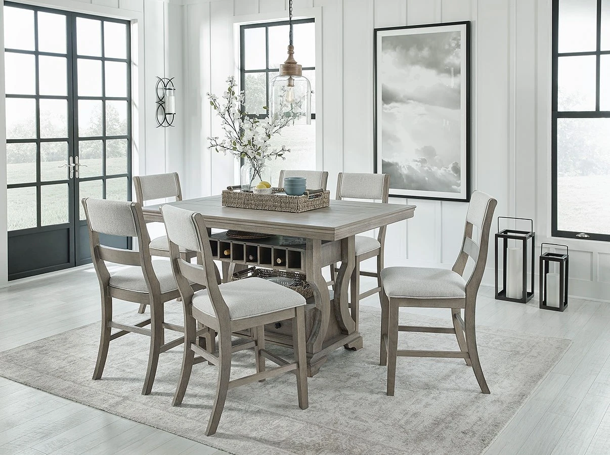 - OverviewPut a simple twist on your approachable sense of style with this classically charming Moreshire Counter Height Dining Room Set by Signature Design. A glazed bisque finish covers the wire-brushed textural surface, with natural wood undertones bringing additional dimension. Storage drawers, a shelf and wine cubbies decorate the table’s base, infusing this chic piece with elegant functionality.