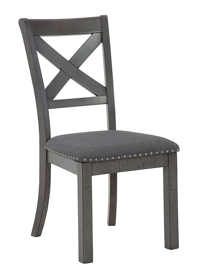 - OverviewGoing gray in the best possible way. This Myshanna upholstered dining chair wows with an utterly on-trend smoky gray finish and X-back styling. Its softly cushioned seat with gray textured upholstery and nailhead trim will have you lingering a little longer at mealtime. Just a touch of distressing helps it fit right in with your modern farmhouse decor.