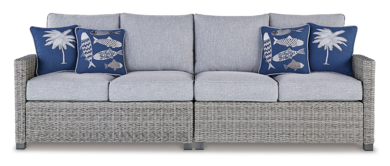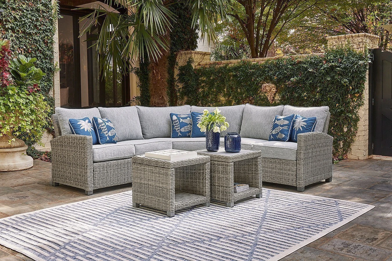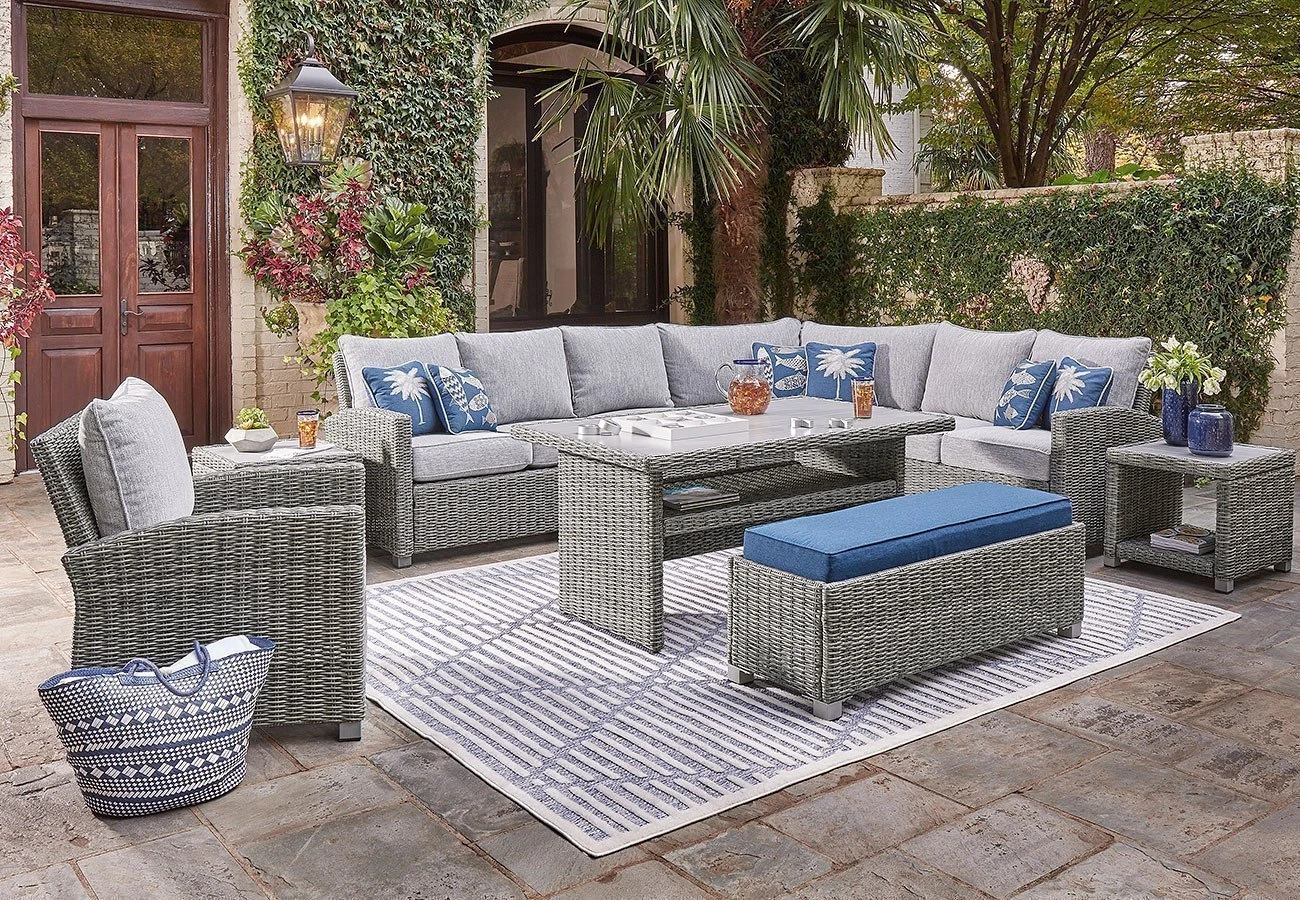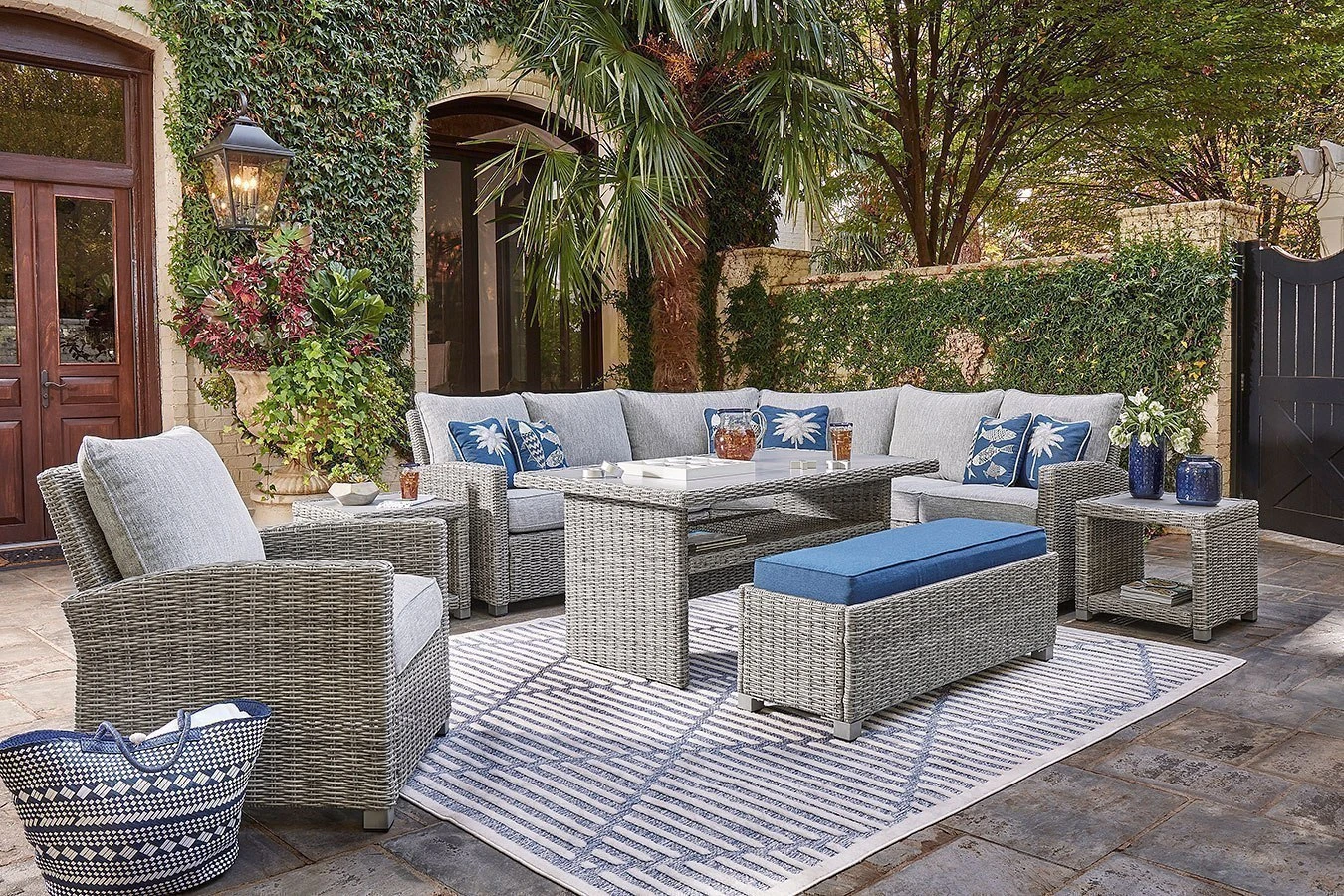 - OverviewIndulge in backyard bliss. This Naples Beach Outdoor Seating Collection by Signature Design has a straightforward sense of style with its light gray resin wicker and wood-look finish. Gray high-performance Nuvella Premium fabric covers the seat and back cushions, weathering the elements and keeping your aesthetic casually cool.