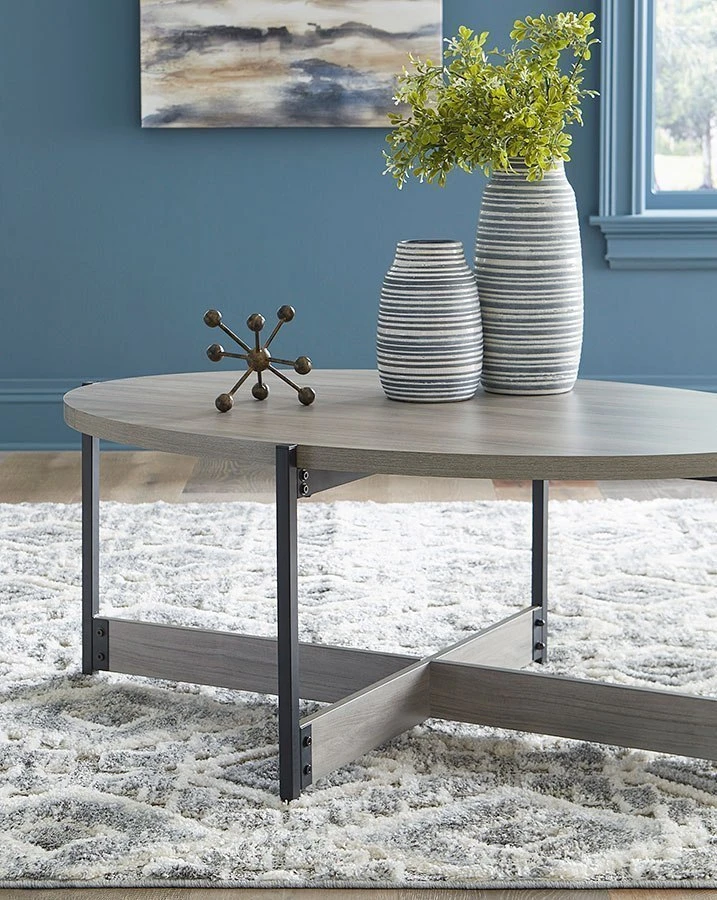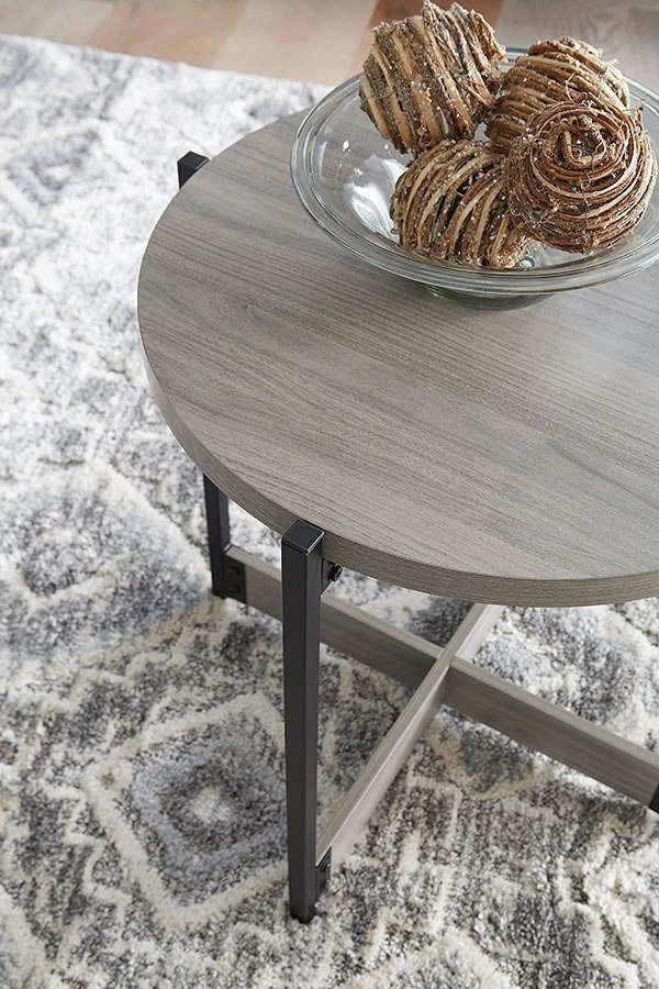 - OverviewExperience infinite style possibilities with this sleekly designed Nevilyn 3-Piece Occasional Table Set by Signature Design. Barn wood gray tops and stretchers seamlessly transition into matte black metal legs for a clean look with edgy flair. The oval-shaped coffee table and round end tables allow for a variety of styling options around sectionals and sofas. Heat-, scratch- and water-resistant melamine tops provide a finishing touch to this modern set.
