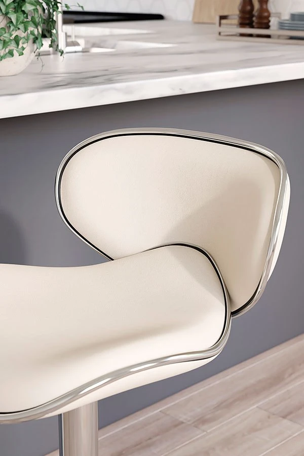 - OverviewHave a taste for highly contemporary style? You’re sure to find this posh and polished Pollzen Barstool by Signature Design something to savor. Crafted with a sturdy steel frame beautified with a brilliant chrome-tone finish, this designer bar stool caters to your comfort with an adjustable height feature and swivel pedestal base. The cushioned seat and backrest are covered in a feel-good white faux leather upholstery for clean, modern appeal.