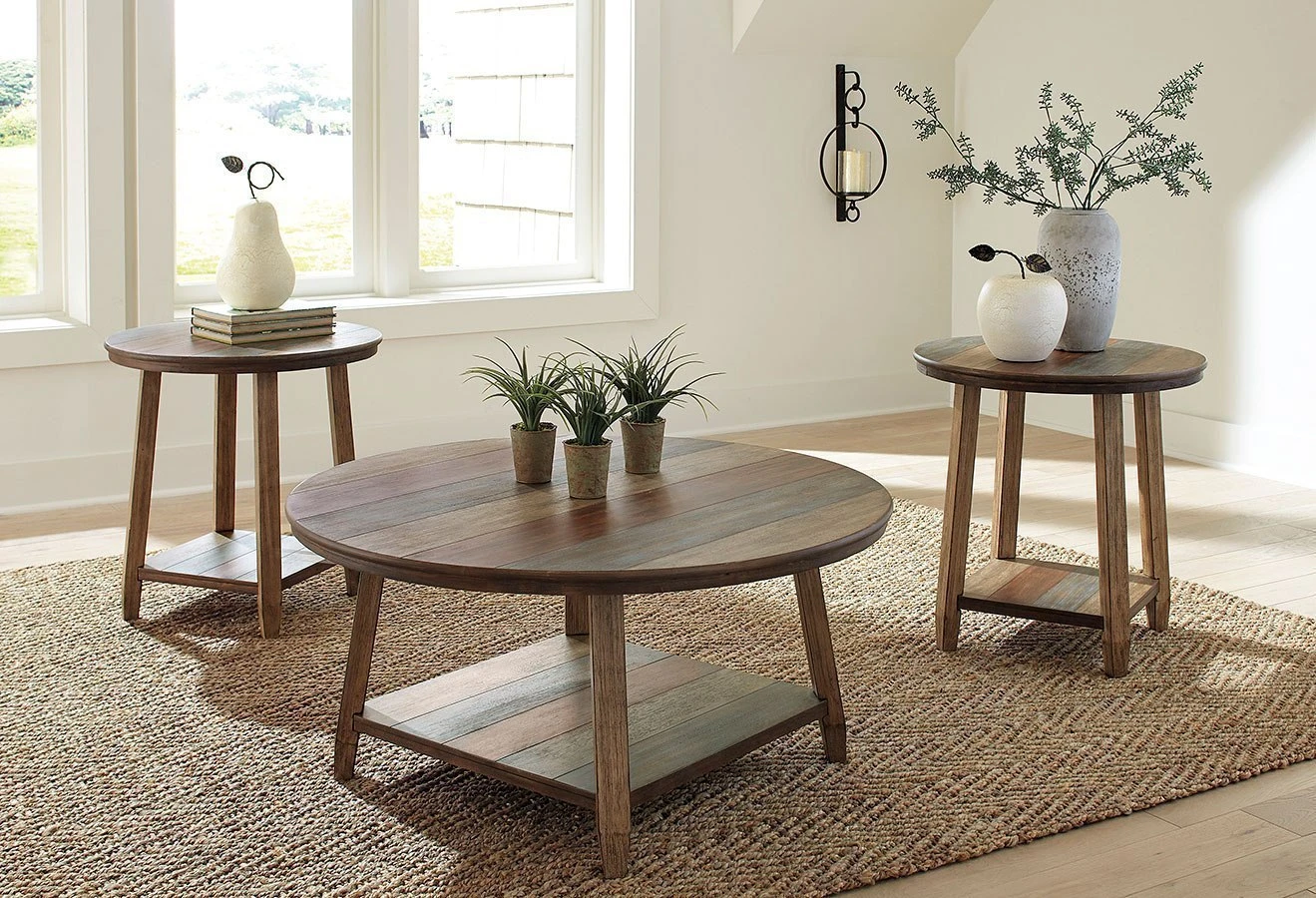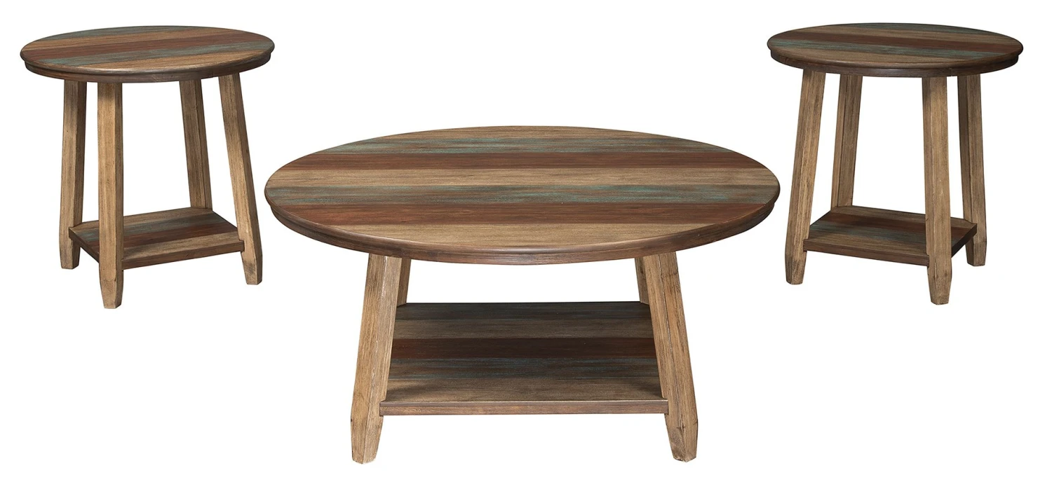 - OverviewFor a fun twist on the typical country look, add this Raebecki 3-Piece Occasional Table Set by Signature Design to your room. The rustic Mexican styling adds subtle color with the plank design ranging from maroon to lighter tan. These tables are perfectly sized for small space living and help keep your space neat with an included display shelf.