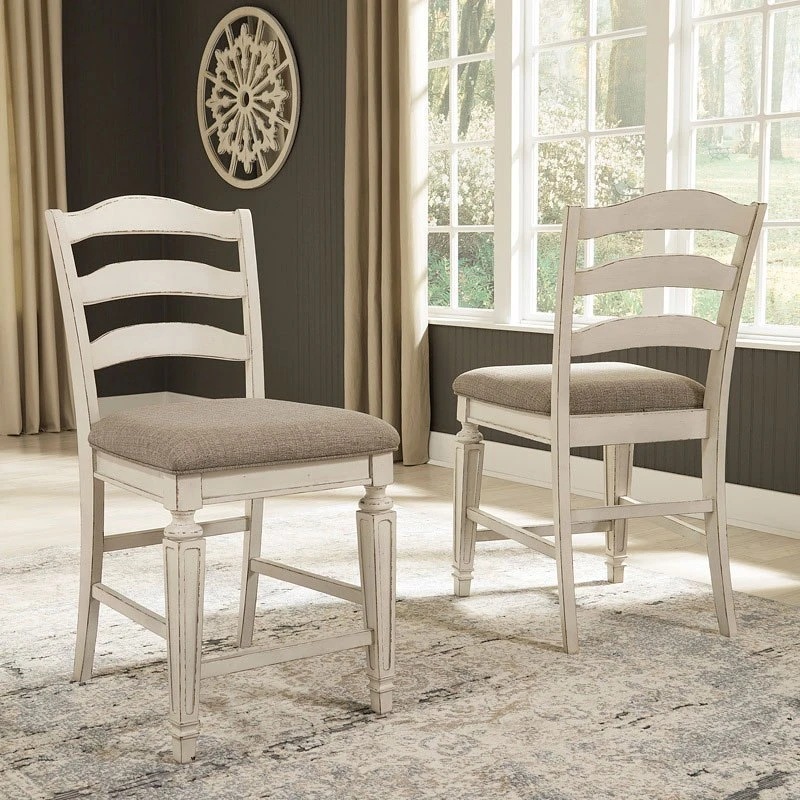 - OverviewBon appetite. With its rounded ladderback styling, chipped white finish and plushly cushioned seat, this Realyn counter-height bar stool by Signature Design has all the right ingredients for a French country-inspired feast for the eyes.