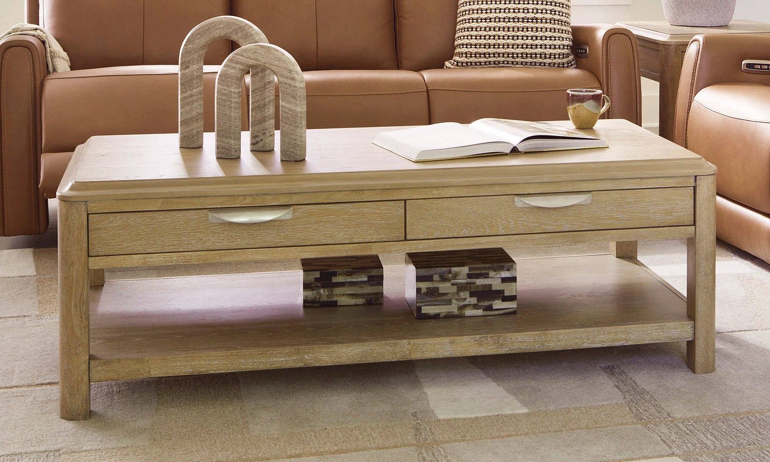 - OverviewThis Rencott Occasional Table Set’s classic yet contemporary good looks are hard to deny. Softly shaped posts with a light oak finish and wire-brushed wood grain texture lend an organic appeal to your soothing space. Roomy drawers cater to additional storage needs while keeping clutter at bay. Plus there’s plenty of display space on the lower shelf for, ahem, coffee table books.