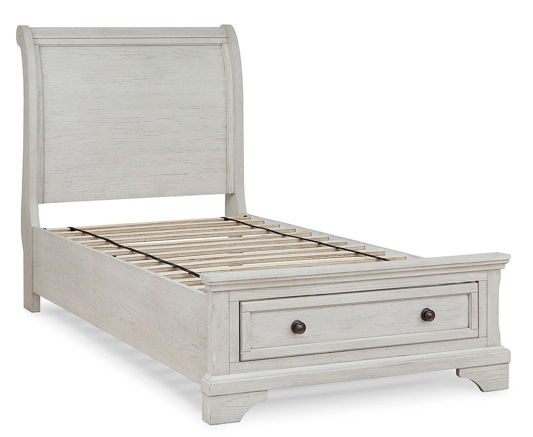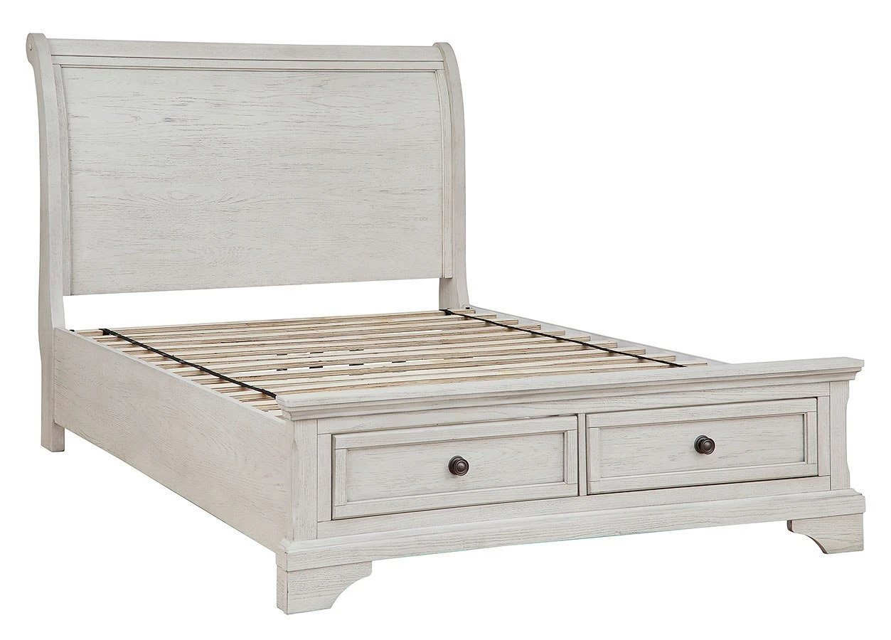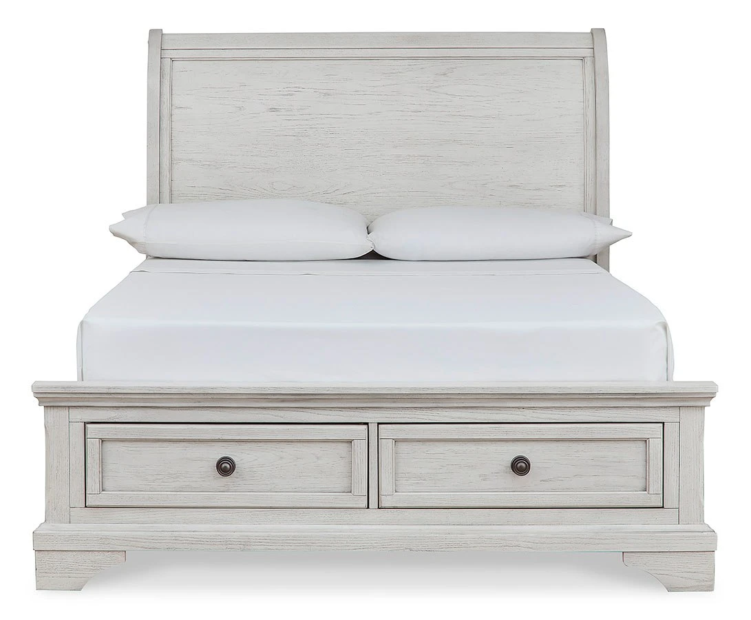 - OverviewElegant, timeless furnishings take your bedroom to the next level. Nothing does that better than this Robbinsdale Sleigh Storage Bed by Signature Design. The antiqued white finish with a wonderful grain texture oozes sophistication, while drawers with dark bronze-tone knobs add a sophisticated touch. Rounding things out, the subtle curve of the headboard keeps the look polished and poised.