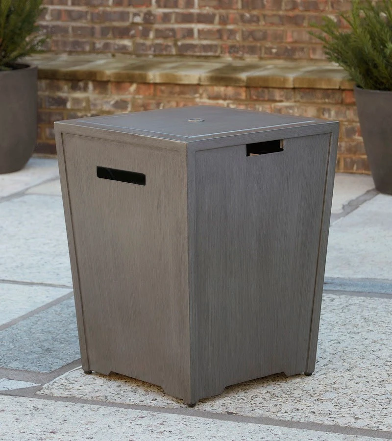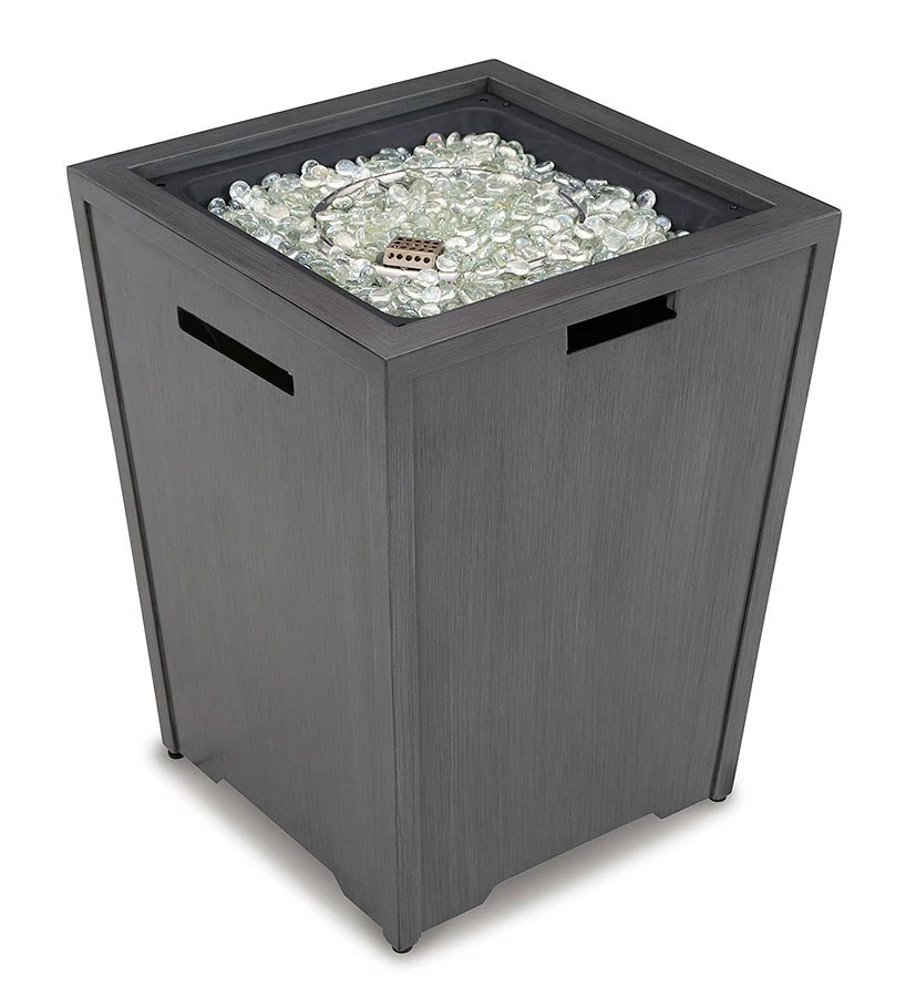 Sporting a hand-painted gray wood-look finish for a sense of earthy elegance, this Rodeway South Fire Pit by Signature Design is sure to turn your backyard space into a hot spot for entertaining. The way its flickering flame seems to float on a bed of clear glass beads is truly mesmerizing. This outdoor fire pit, crafted with sturdy rust-proof aluminum and equipped with a burner cover and a polyester protective cover, will weather the seasons beautifully.