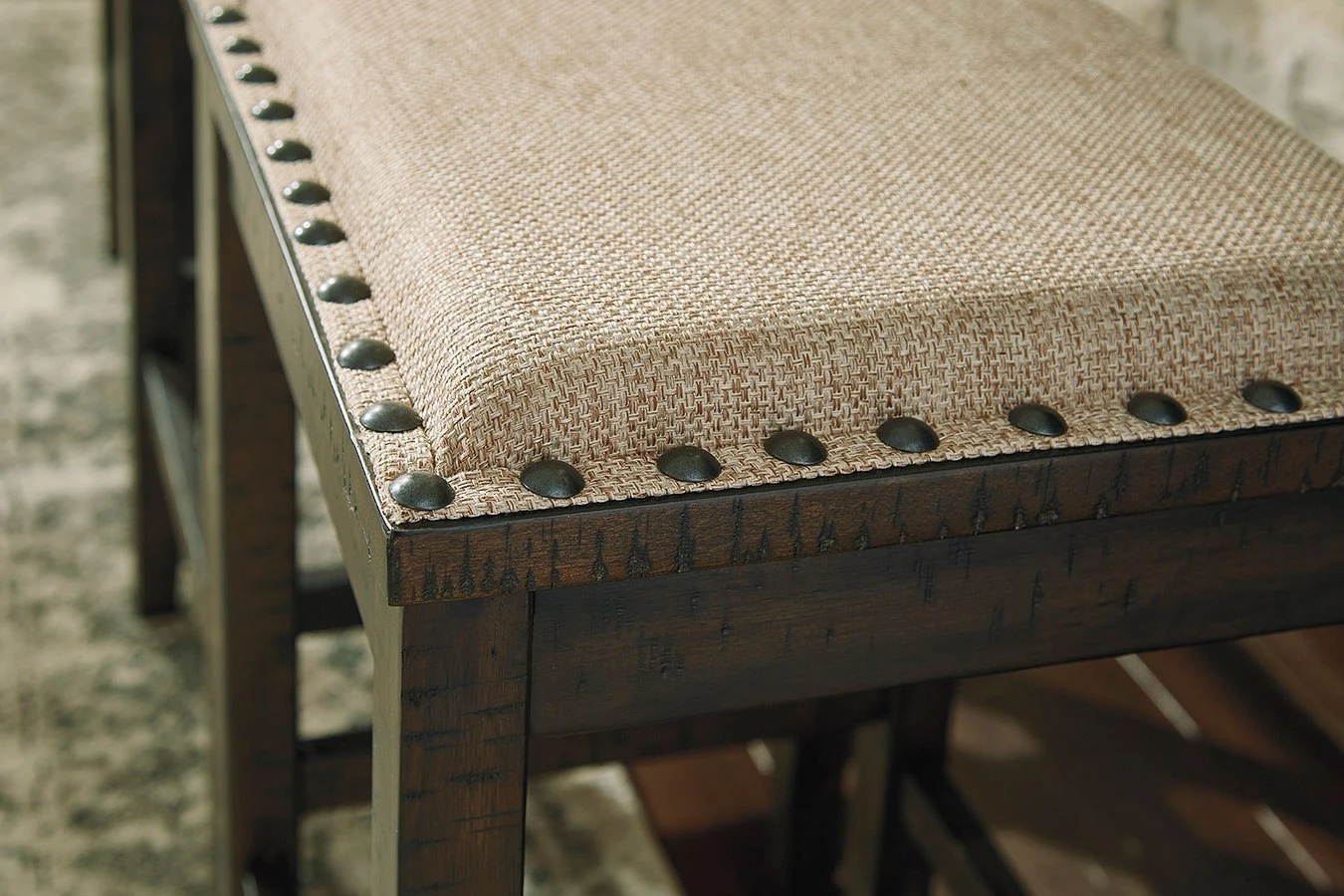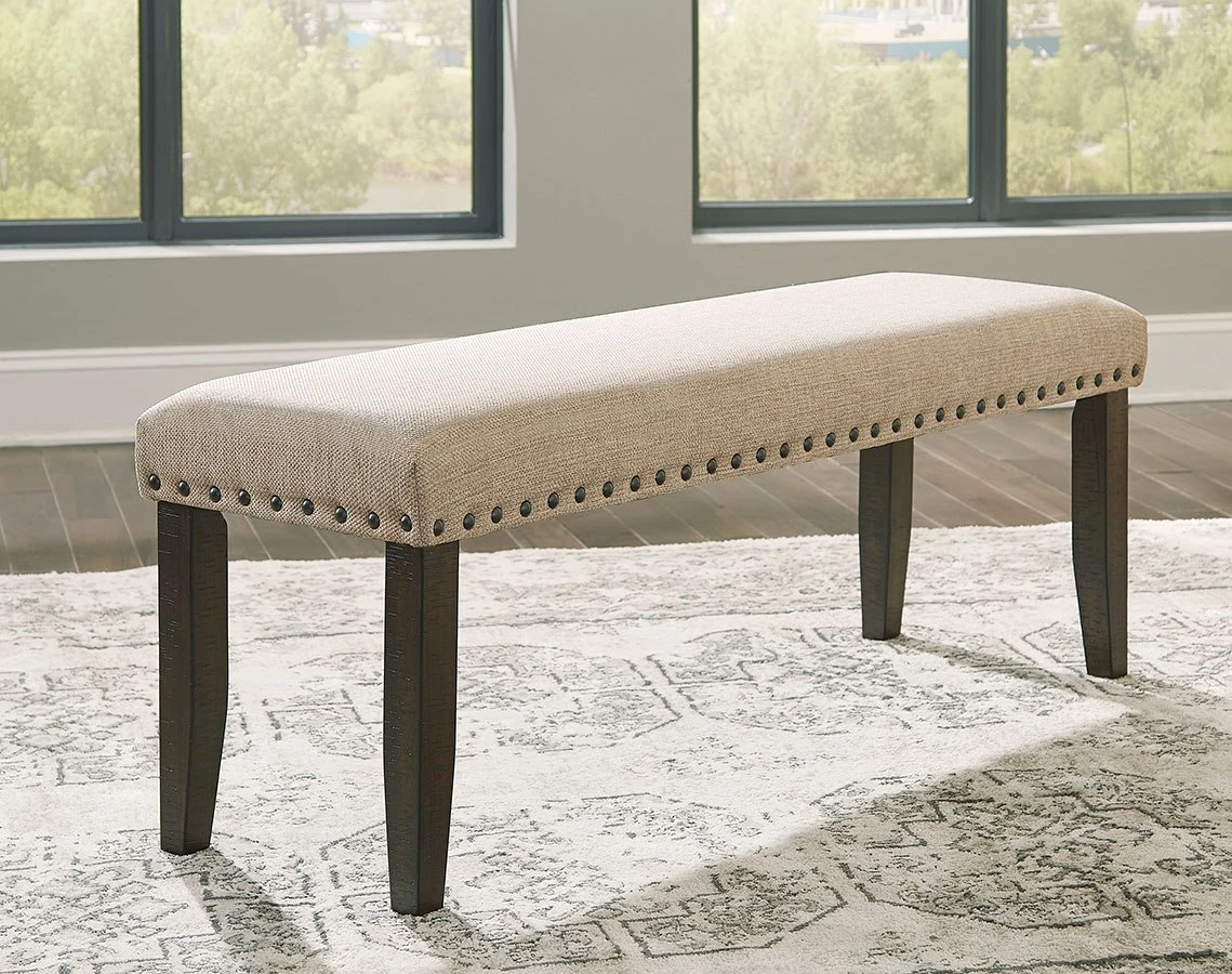 - OverviewMake gatherings memorable with ever-trendy farmhouse seating. The Rokane dining bench by Signature Design keeps things cozy with light brown textured fabric and a cushioned seat. Punctuated with nailhead trim and the beauty of natural wood grain legs, this urban farmhouse piece is sure to impress come mealtime.