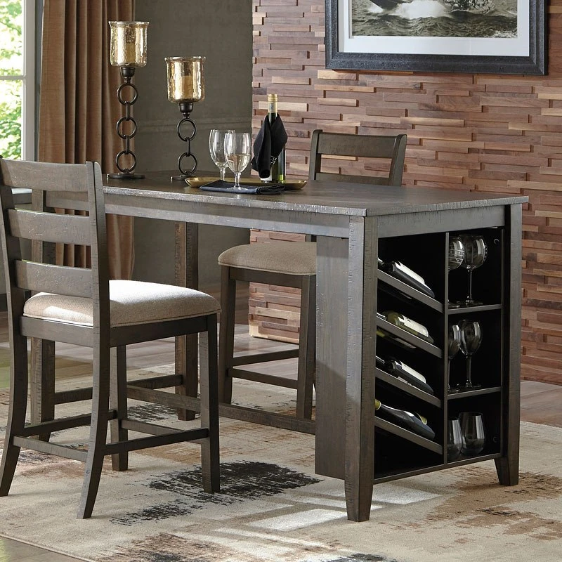 - Overview“Rough sawn” texture and a warm brown finish is where the style begins and your dining area or game room is where this Rokane Counter Table by Signature Design belongs. Relaxed elegance is easy with a built-in wine rack and open shelving. Find functionality and contemporary style at its best with this counter table.