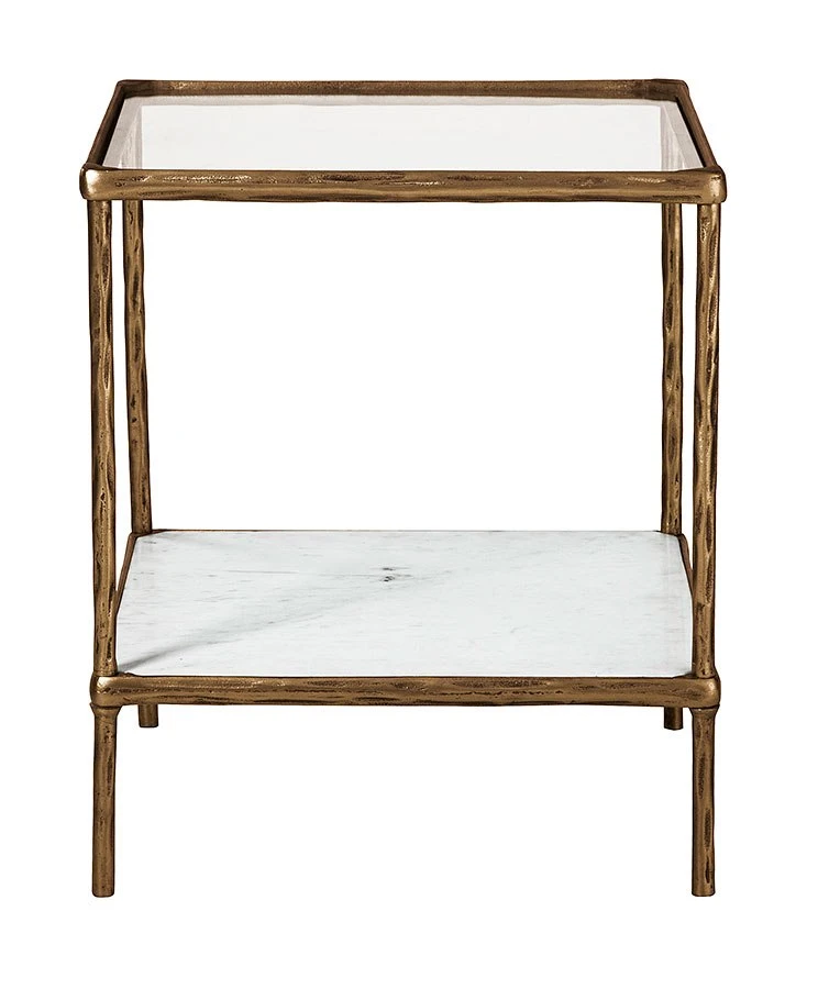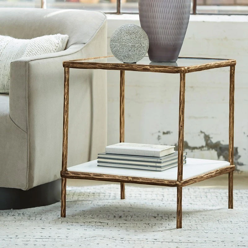 - OverviewClassic in design with a dash of textural appeal, this Ryandale accent table by Signature Design provides both flair and function. The glass tabletop offers the perfect perch for a lamp, while the white marble lower shelf is ideal for resting trendy coffee table books and other decorative pieces. An antiqued brass-tone finish on the frame has a rustically luxe look that remains versatile, suiting spaces from casual to contemporary.