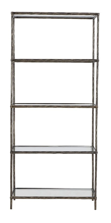 - OverviewClassic in design with a dash of textural appeal, this Ryandale bookcase by Signature Design provides endless possibilities for displaying your decor. Five shelves offer the perfect perch for potted plants, books or your favorite framed artwork. The frame’s antiqued pewter-tone finish has a chic, distressed look that remains versatile, suiting spaces from casual to contemporary.