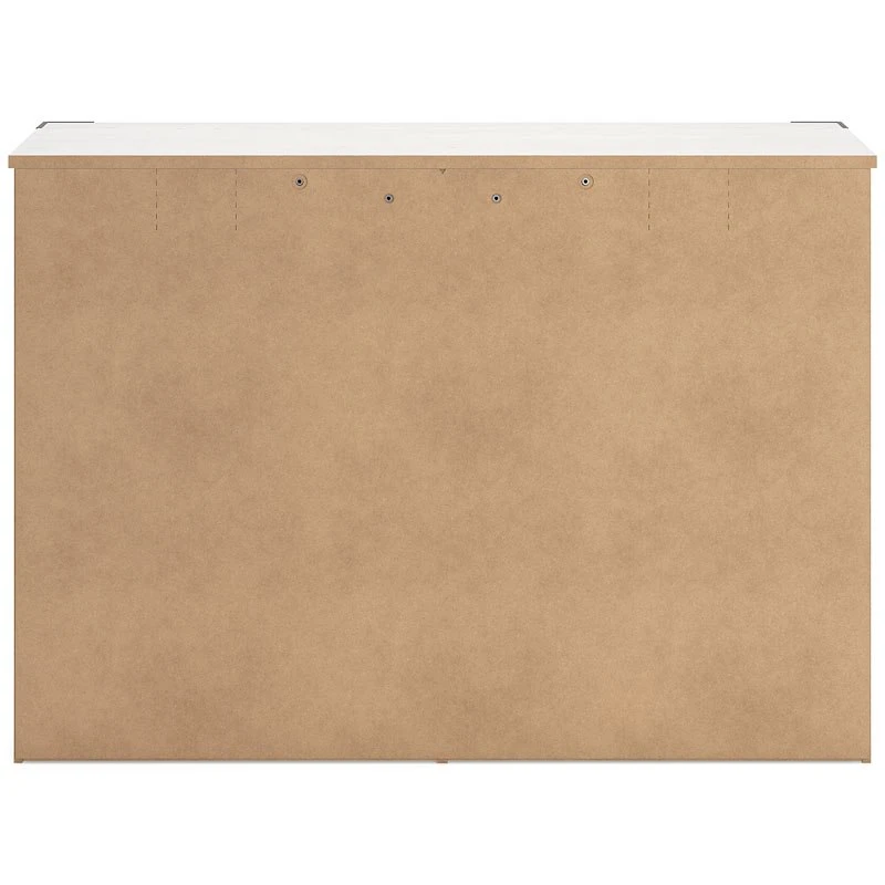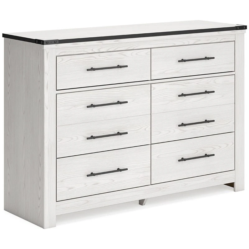 - OverviewThis Schoenberg dresser by Signature Design harmonizes effortlessly with your farmhouse-chic approach to contemporary style. Curate your space with the charmingly classic look of its white rustic finish, with sleek dark pewter-tone handles adding a modern touch. Faux metal banding and nailhead corner accents infuse the clean-lined design with delightful vintage character.