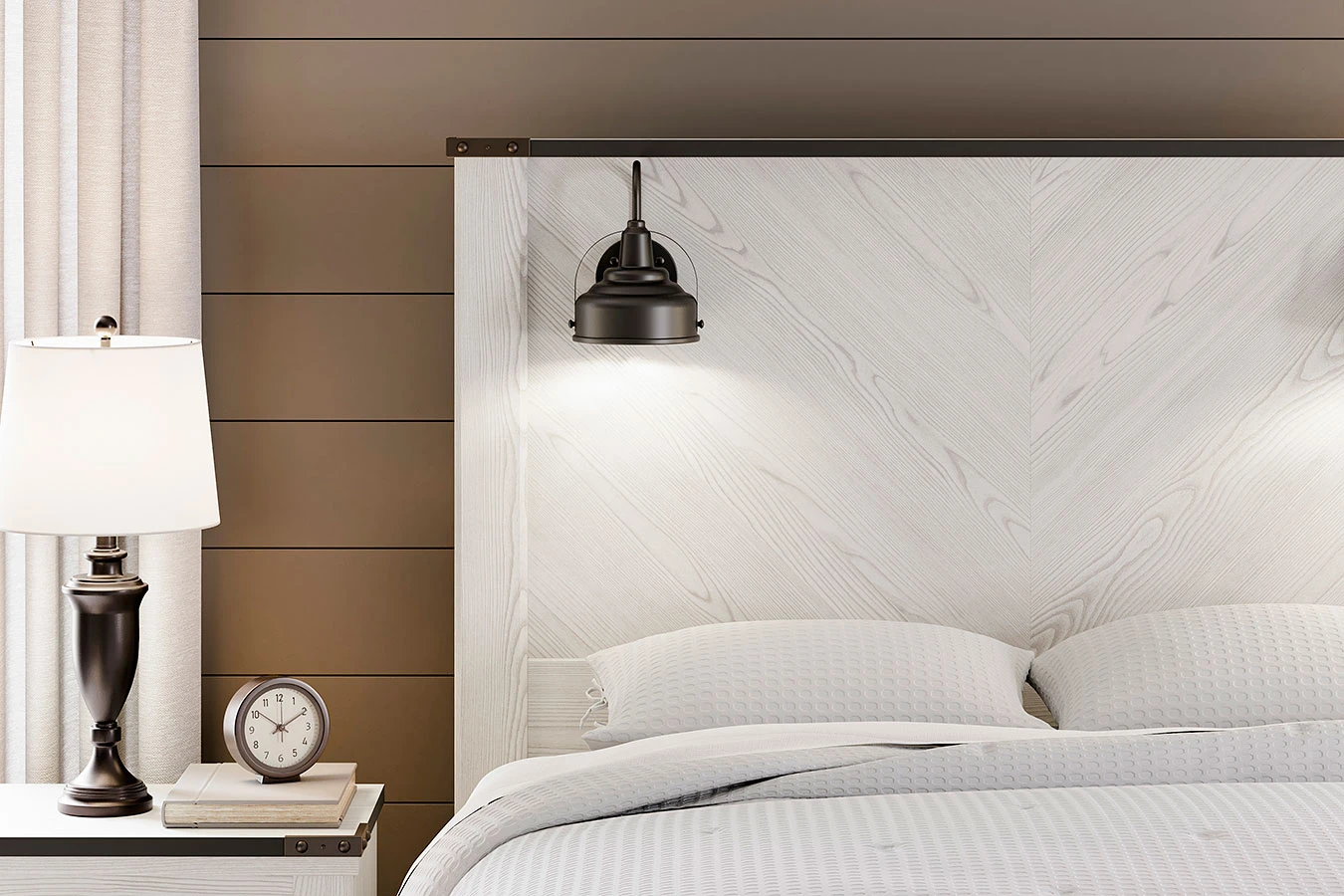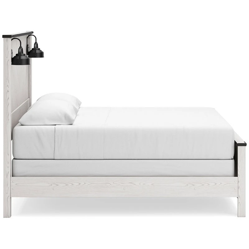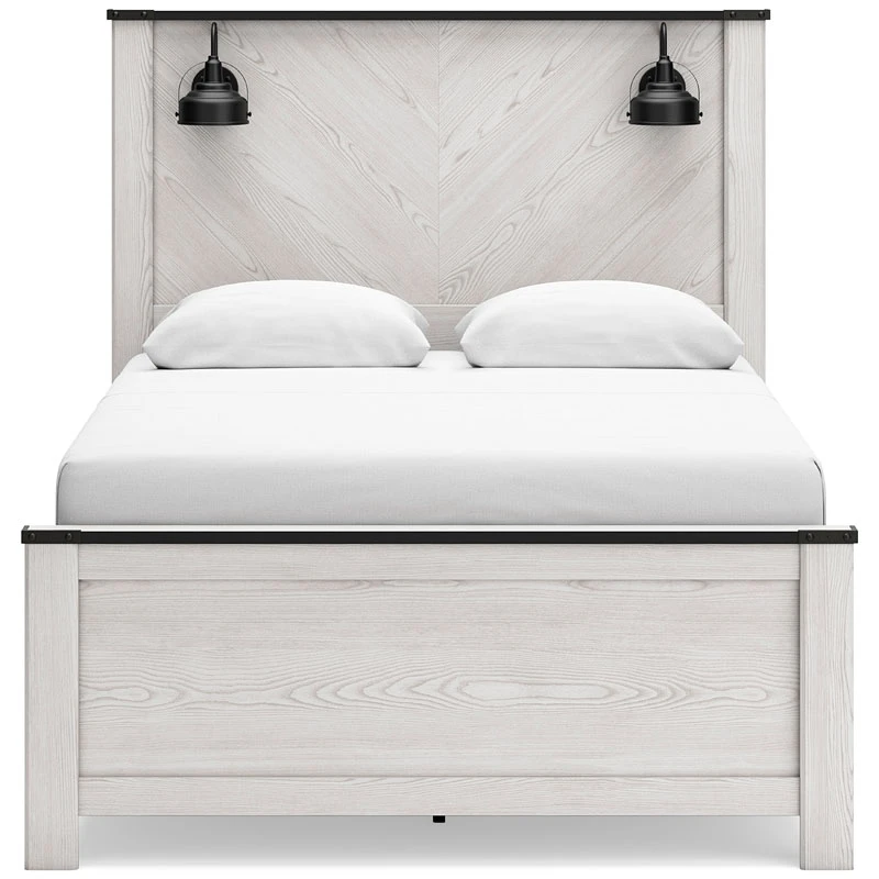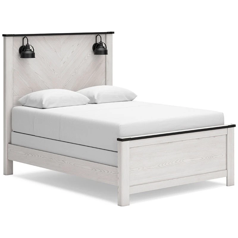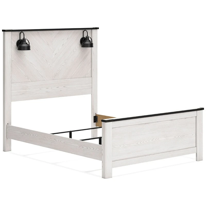 - OverviewThis Schoenberg panel bed by Signature Design harmonizes effortlessly with your farmhouse-chic approach to contemporary style. Curate your space with the charmingly classic look of its white rustic finish. Faux metal banding with nailhead corner accents infuses delightful vintage character to the clean-lined design. Polishing off the piece, matte black sconce lights merge simply stunning form and function.
