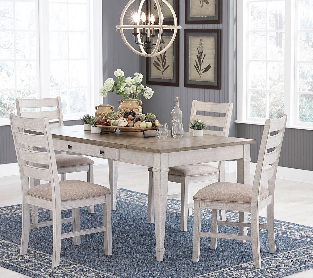 Set the scene for coastal chic or modern farmhouse living with the Skempton dining room table by Signature Design. Clean-lined, simply striking table doubles the charm with a brown tone top with plank effect, paired with a grayish white base with rub through effect for timeworn appeal. Two convenient side drawers and a lift-top bin offer abundant storage options. Versatile design allows for multi-purpose use – table to task space, one piece does it all. Styled to comfortably seat six, this table makes room for one and all.