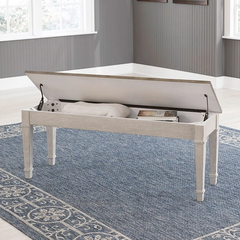 - OverviewThis Skempton bench by Signature Design invites you to strike a note for small space living. An inspired choice for coastal chic or modern farmhouse settings, this piano style bench with under seat storage sports a grayish white finish with rub through effect for timeworn appeal.
