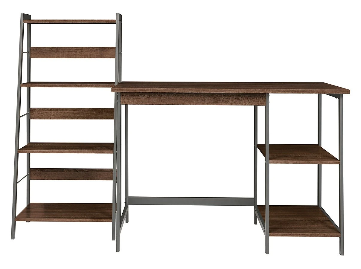 - OverviewMake it work in high style with this Soho laptop desk with bookcase. This 2-piece set comes with a sleek desk with two shelves to hold your desktop or a printer. Use the 4-shelf bookcase to hold textbooks or reference materials. Distressed warm brown and gunmetal finishes give the modern, open-concept design a dramatic touch.