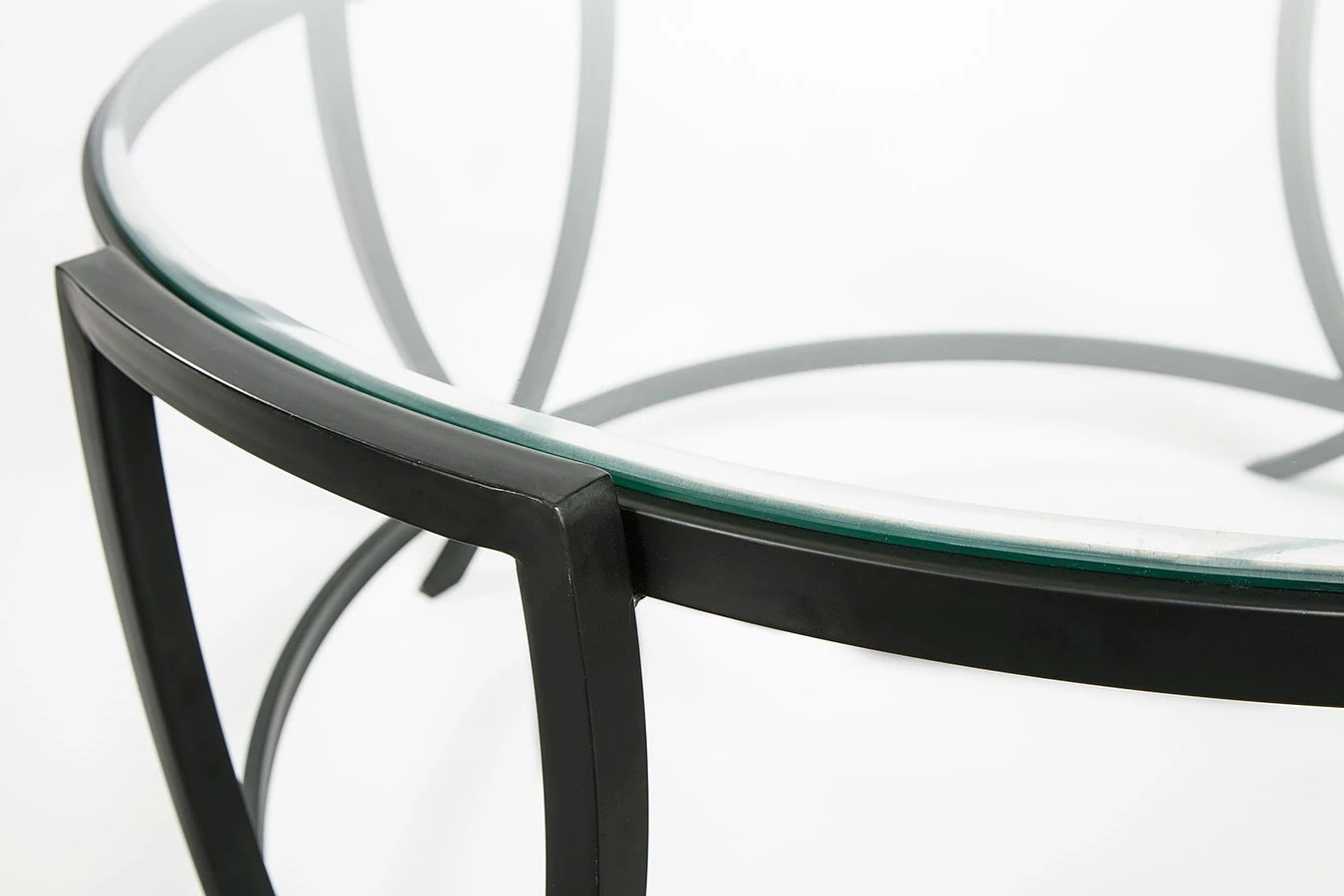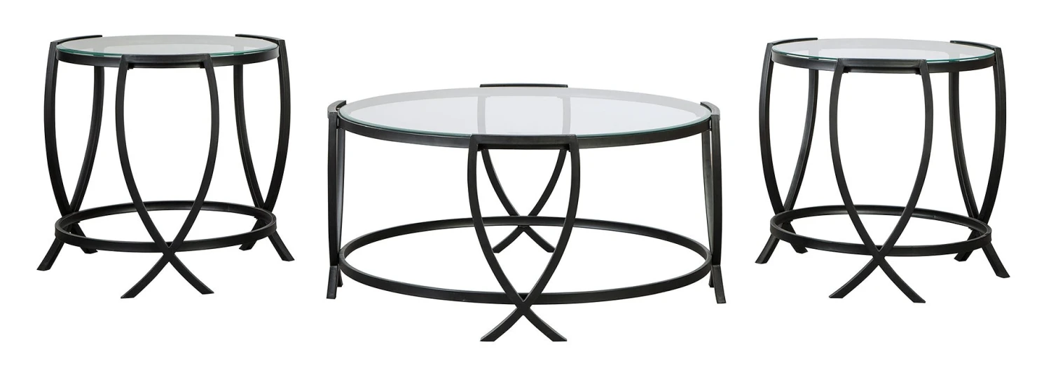 - OverviewThe Tarrin 3-Piece Occasional Table Set by Signature Design features casual contemporary styling, thin line metal arc X-motif leg design. The tops have inset clear tempered glass with beveled edges for a contemporary feel.