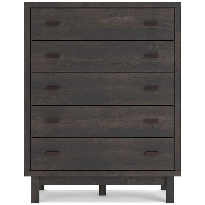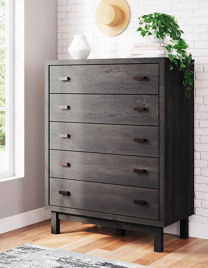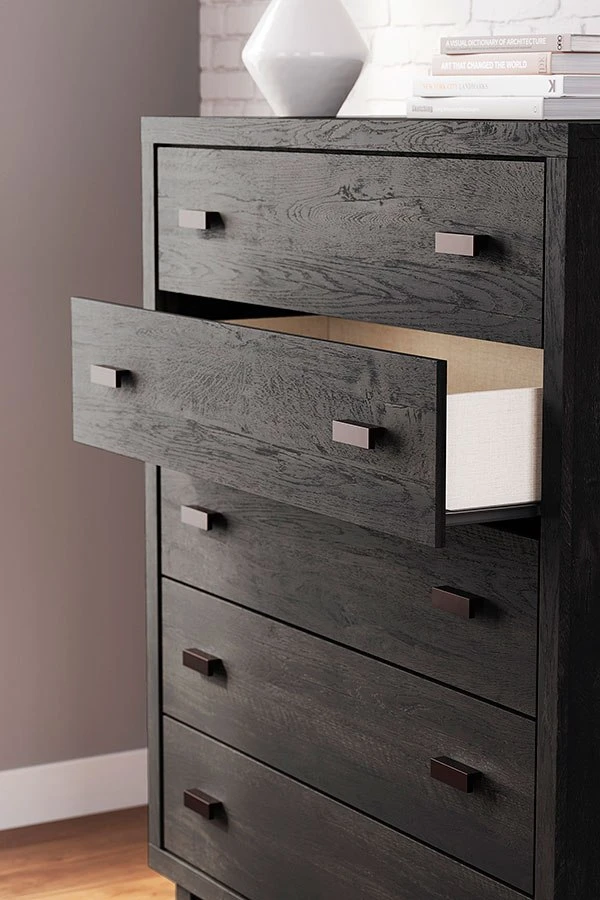 - OverviewLess. Never more beautiful. Rich in rustic yet contemporary character and decidedly simple on the details, this Toretto wide chest of drawers by Signature Design maximizes the beauty of minimalism. Easy-on-the-eyes elements include a block base and a rustic charcoal finish that gives the wood grain aesthetic a highly modern feel. Easily stow your wardrobe, spare linens and throws in the spacious drawers.