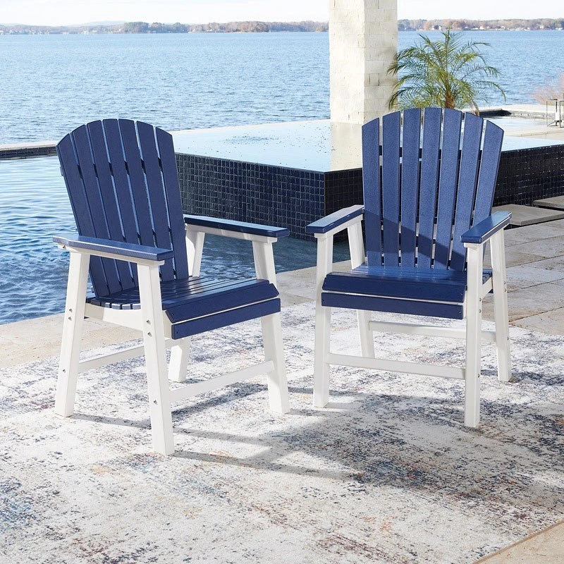 - OverviewPull up a chair on the back deck or poolside and gather around for good times. These two-tone Toretto Outdoor Dining Chairs by Signature Design have sturdy legs in crisp white, with the arms, seat and back in a beautiful blue that matches the clear sky. A slatted seat and back allow drainage to prevent rainwater buildup. Designed to withstand harsh weather, this comfortably casual outdoor duo is made with durable MEGA TUFF HDPE material that won’t chip, rust or peel.