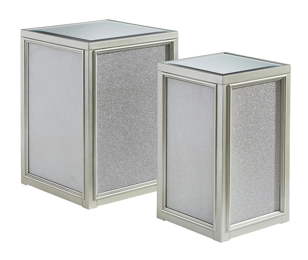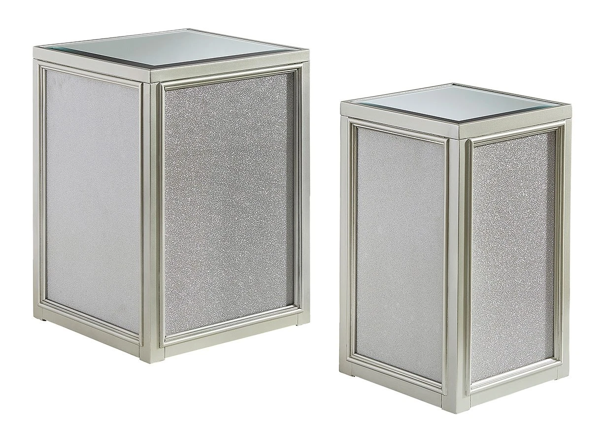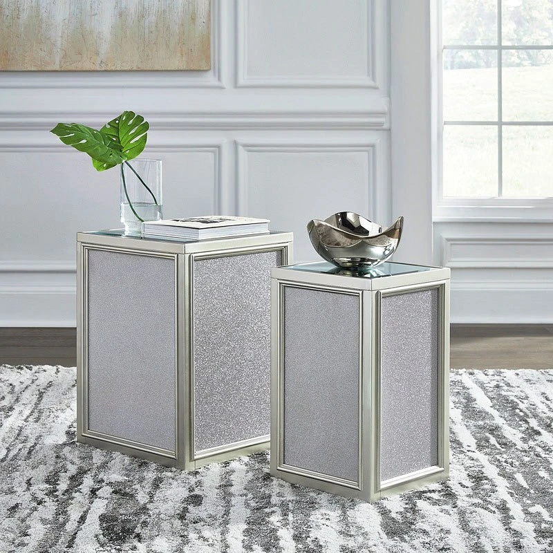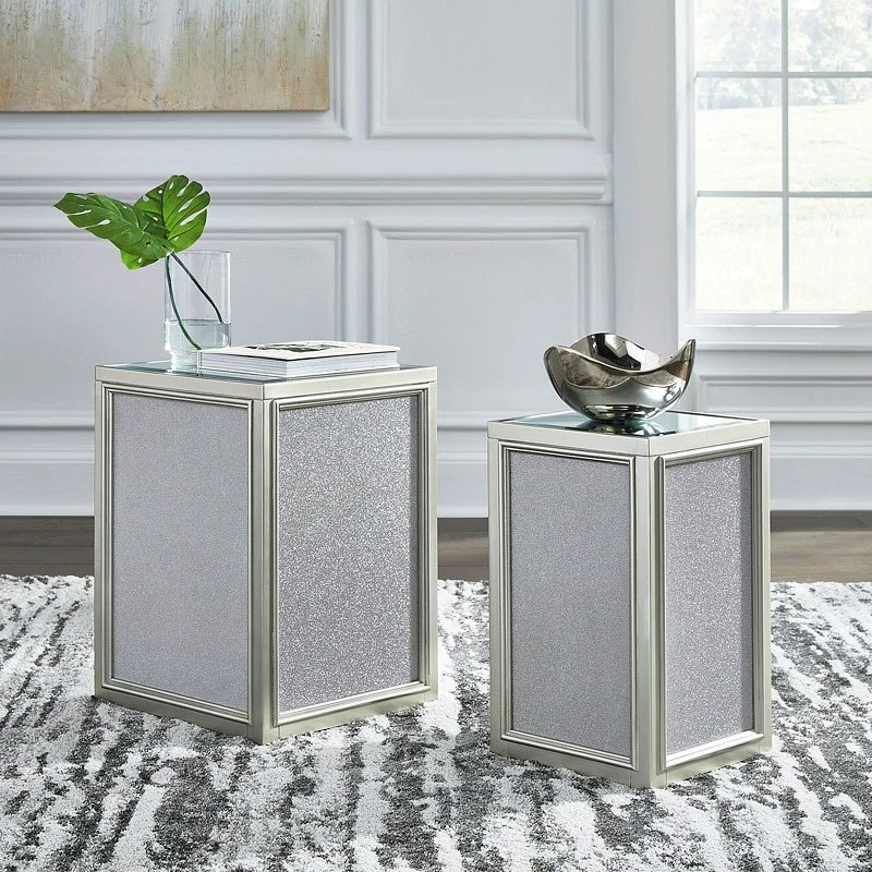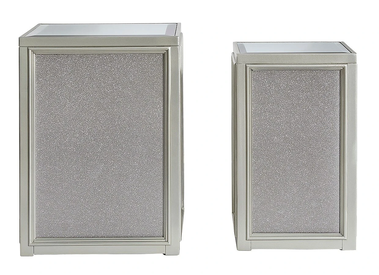 - OverviewReminiscent of Hollywood glamour of yesteryear, this Traleena set of nesting end tables by Signature Design interprets luxury in a decidedly modern way. A dazzling metallic silvertone finish and textured laminate panels for added luster enhance the star power, while the beveled inset mirrored tabletop brings that touch of glam you’ve been yearning for.