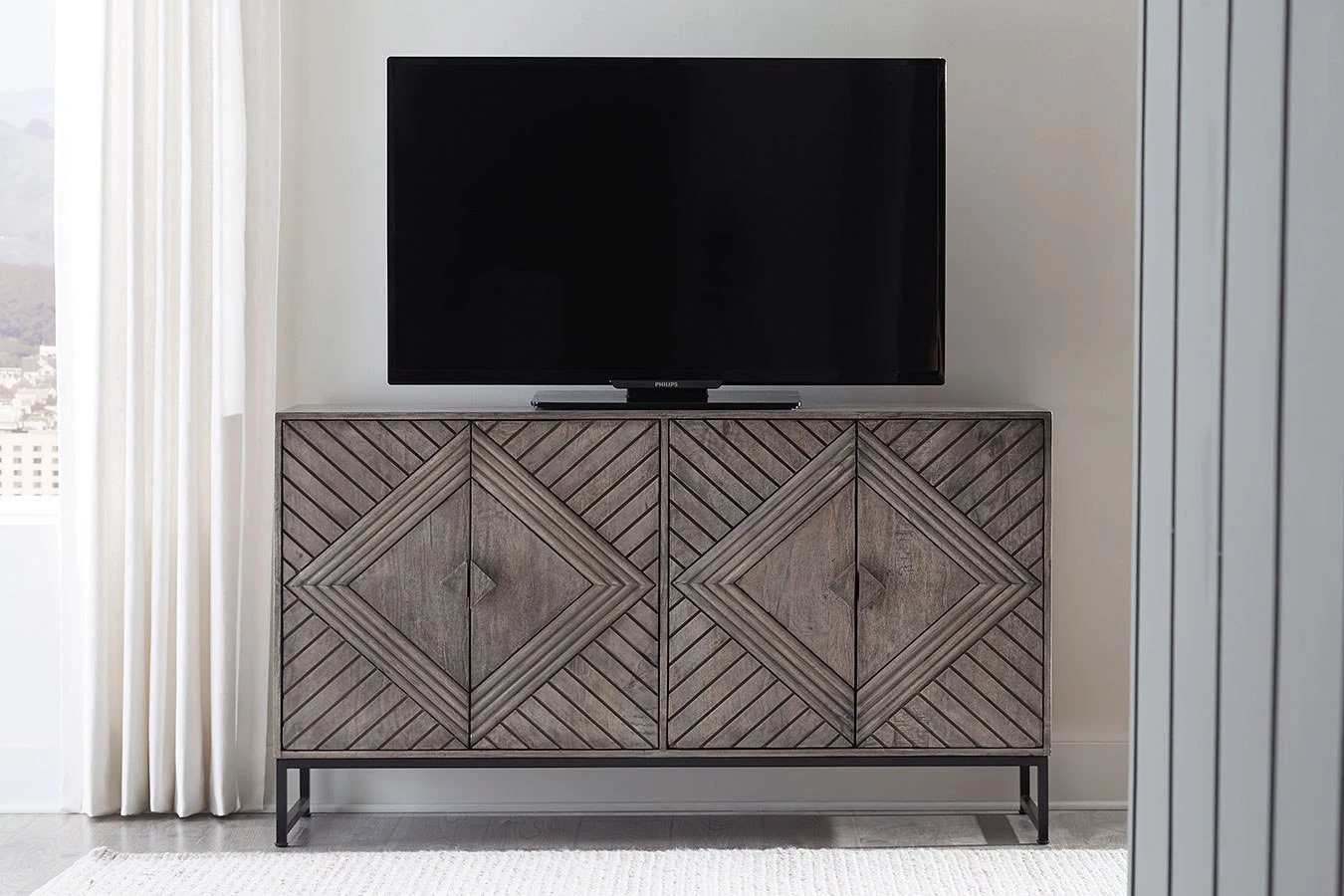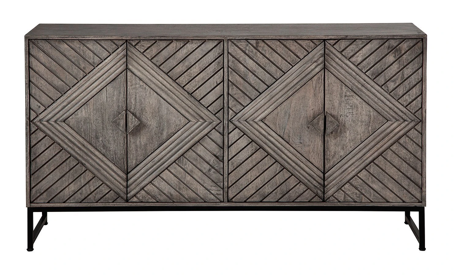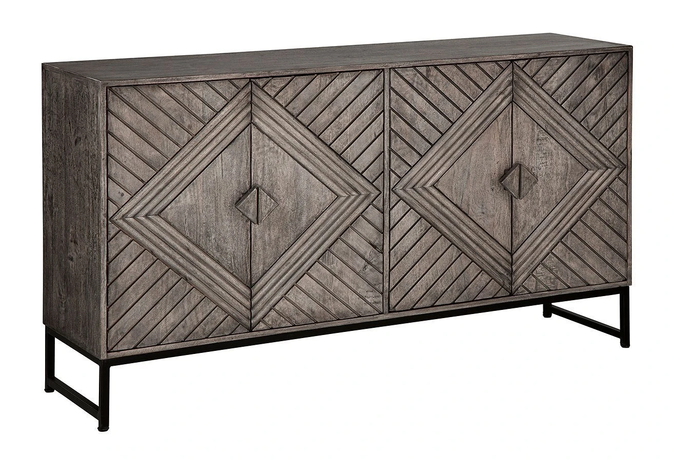 - OverviewFor admirers of understated vintage glamour, this Treybrook Accent Cabinet by Signature Design beautifully complements your desired aesthetic. The classic charm of a distressed gray finish meets chic metropolitan styling, with art deco-inspired door fronts and an industrial black metal base. A balanced blend of contemporary and casual design, this piece is the personification of laid-back luxury.