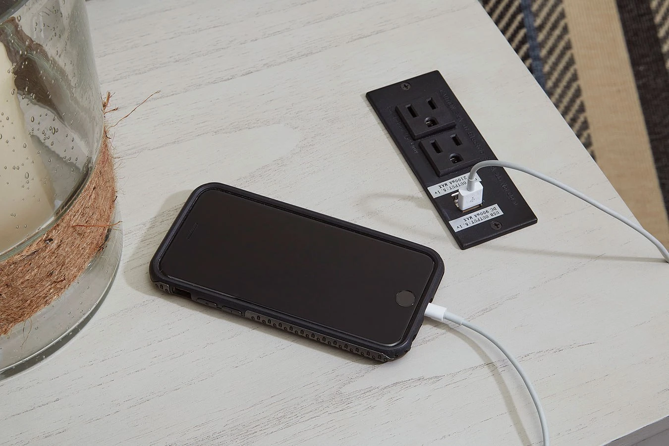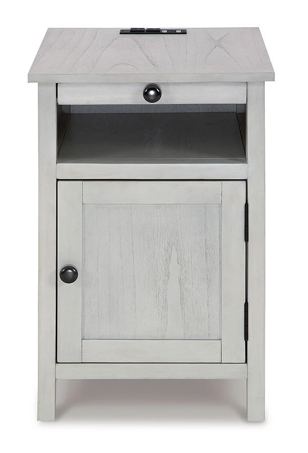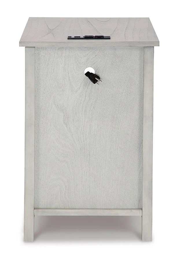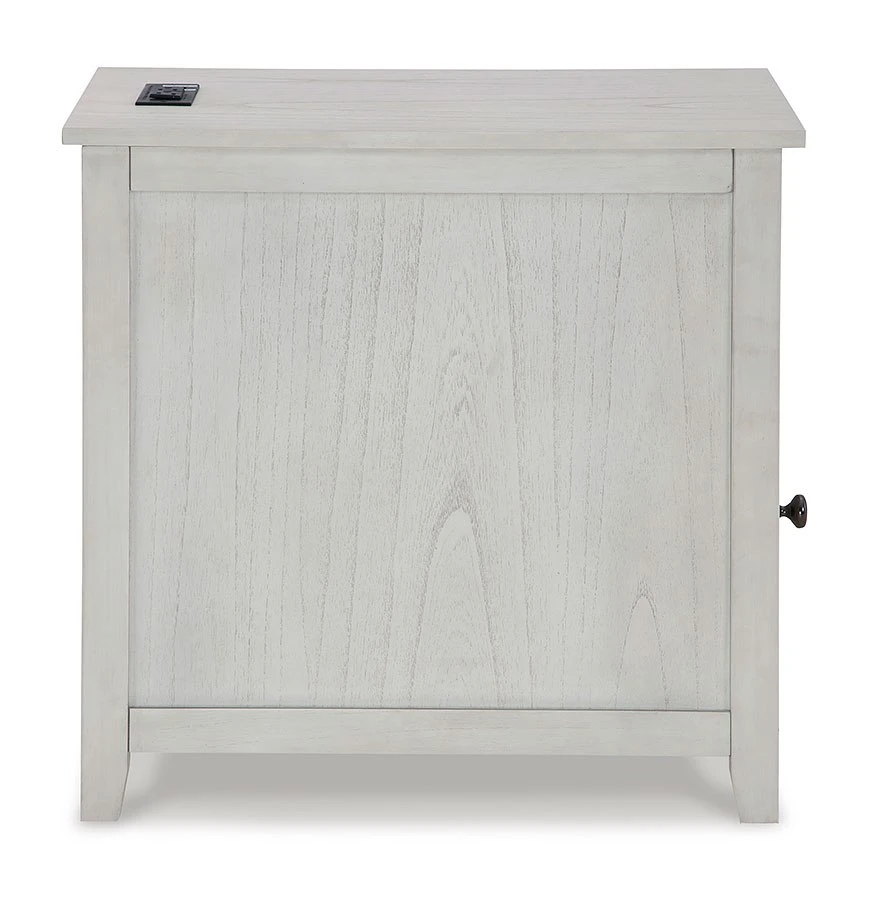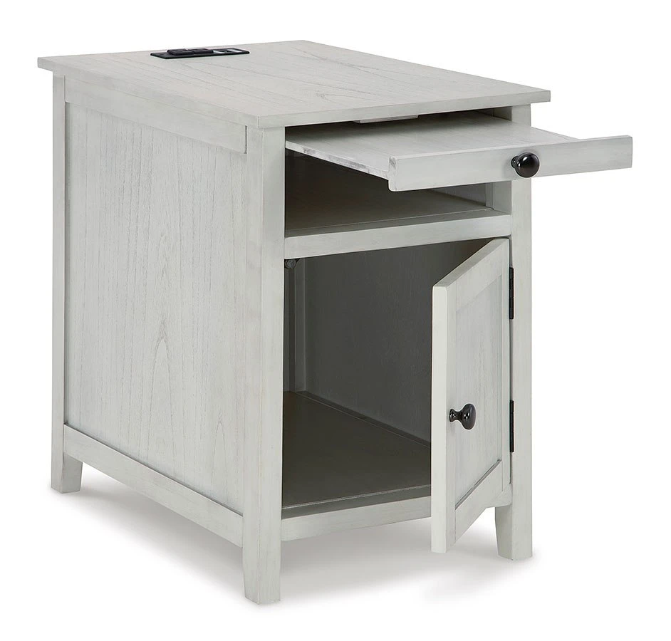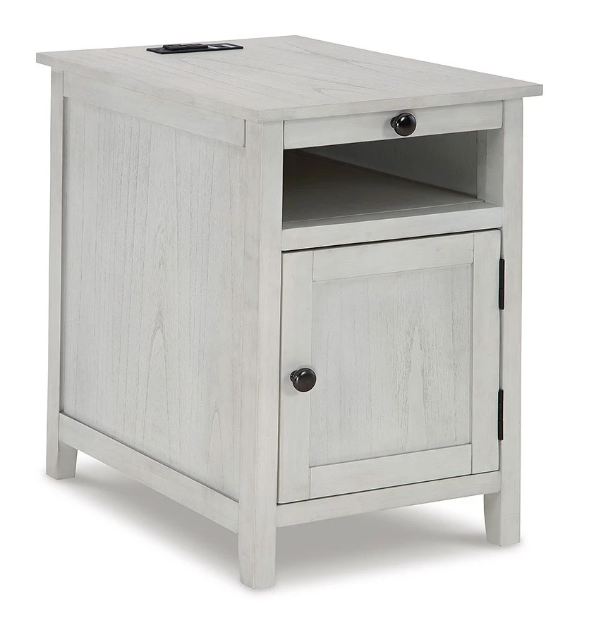 - OverviewAdd big character to a small space with this Treytown Chairside End Table by Signature Design. With its compact size and strong silhouette, it can go anywhere and blend easily into the decor. Less is so much more with the Shaker-inspired design and whitewashed wood grain finish. Loaded with form and function, this end table displays accent pieces and stores essentials securely while keeping devices powered up.