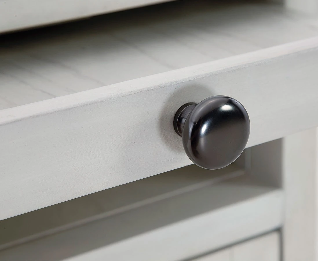Table features storage cabinet, open cubby shelf and pull-out tray