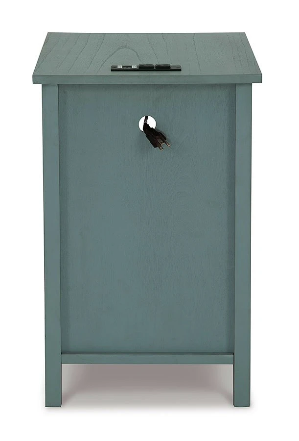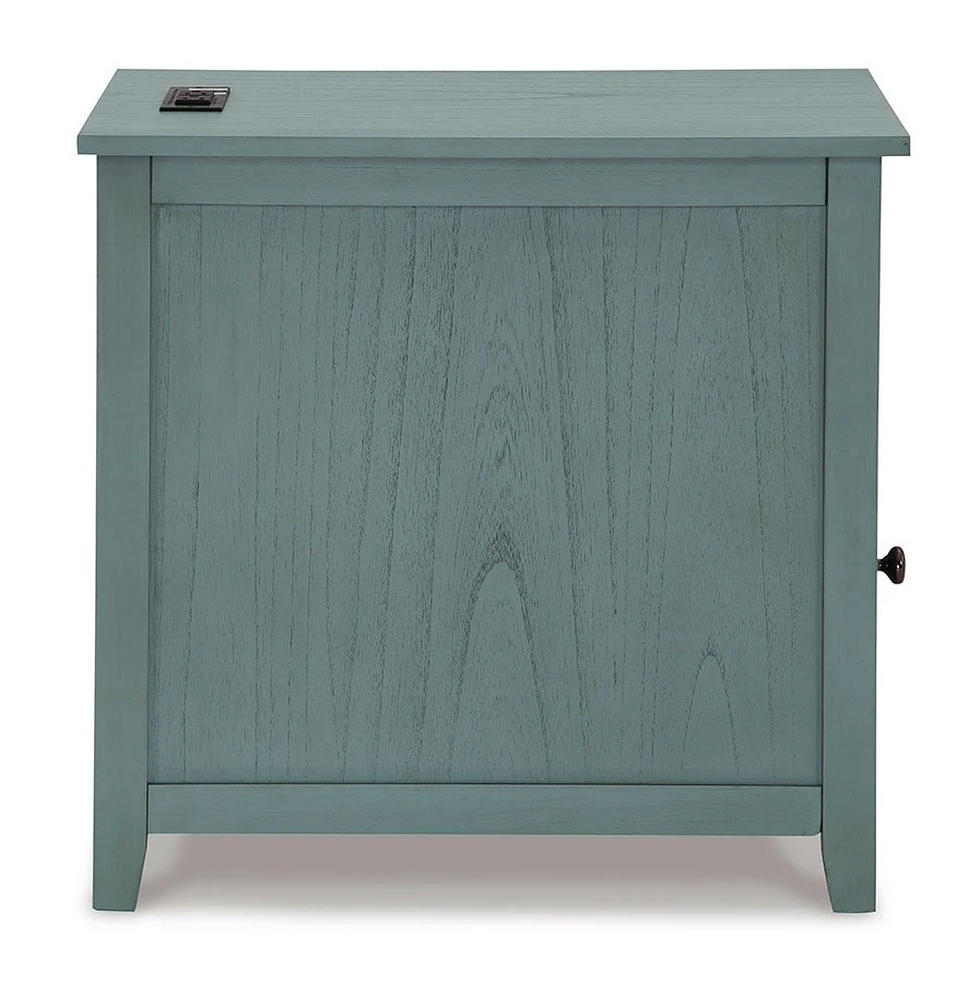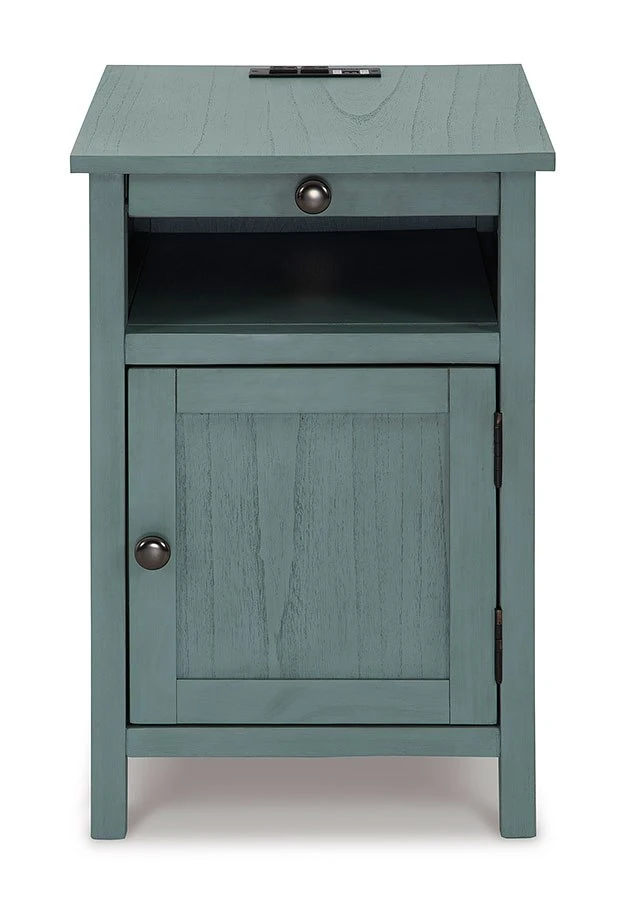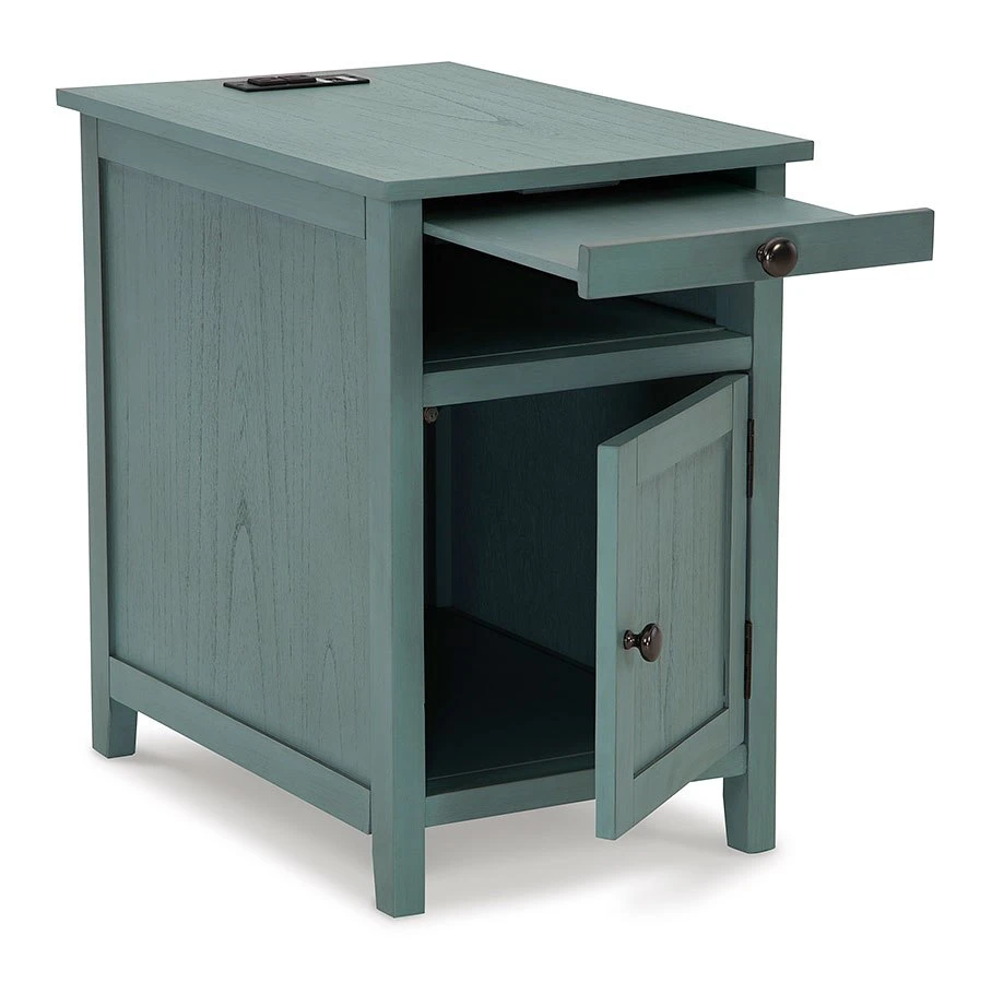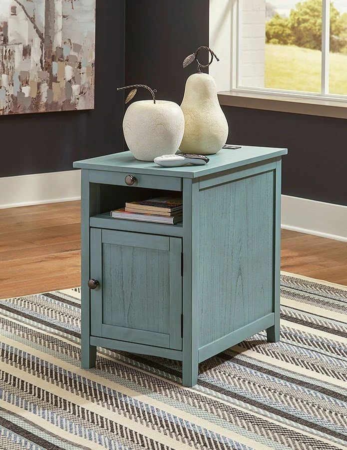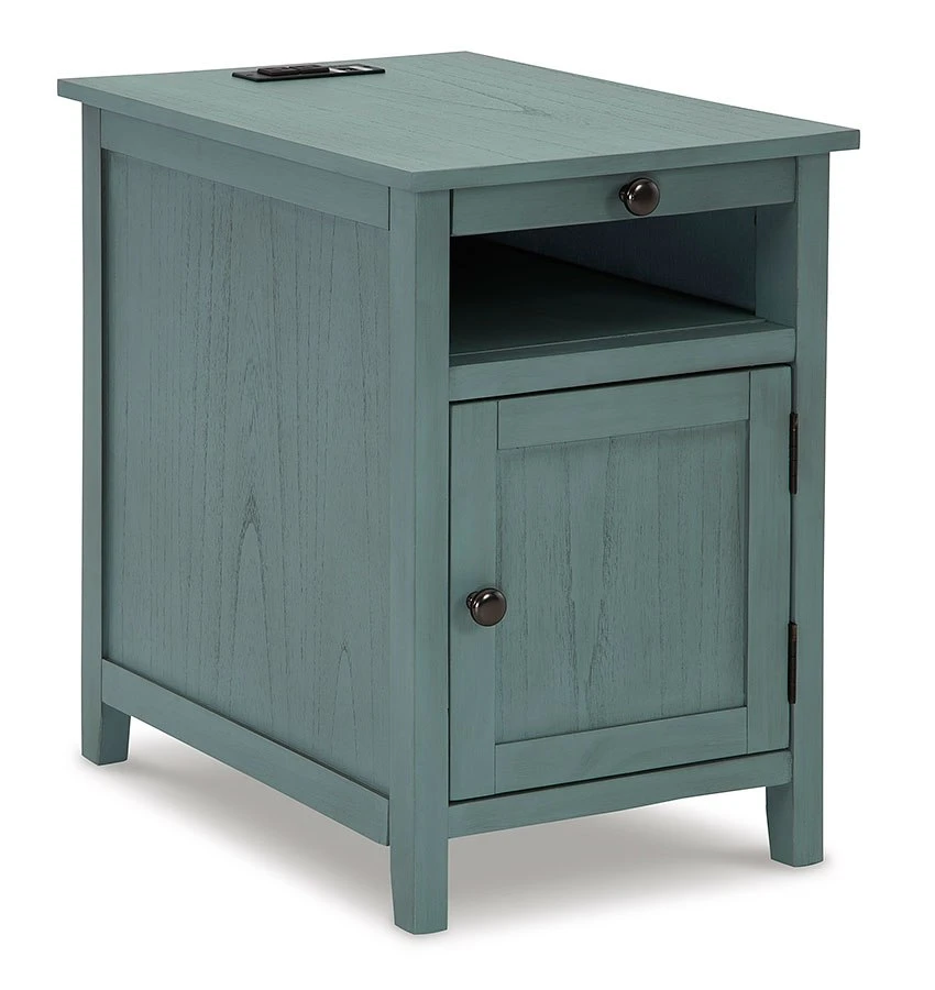 - OverviewAdd big character to a small space with this Treytown Chairside End Table by Signature Design. With its compact size and strong silhouette, it can go anywhere and blend easily into the decor. Less is so much more with the Shaker-inspired design and teal wood tone finish. Loaded with form and function, this end table displays accent pieces and stores essentials securely while keeping devices powered up.