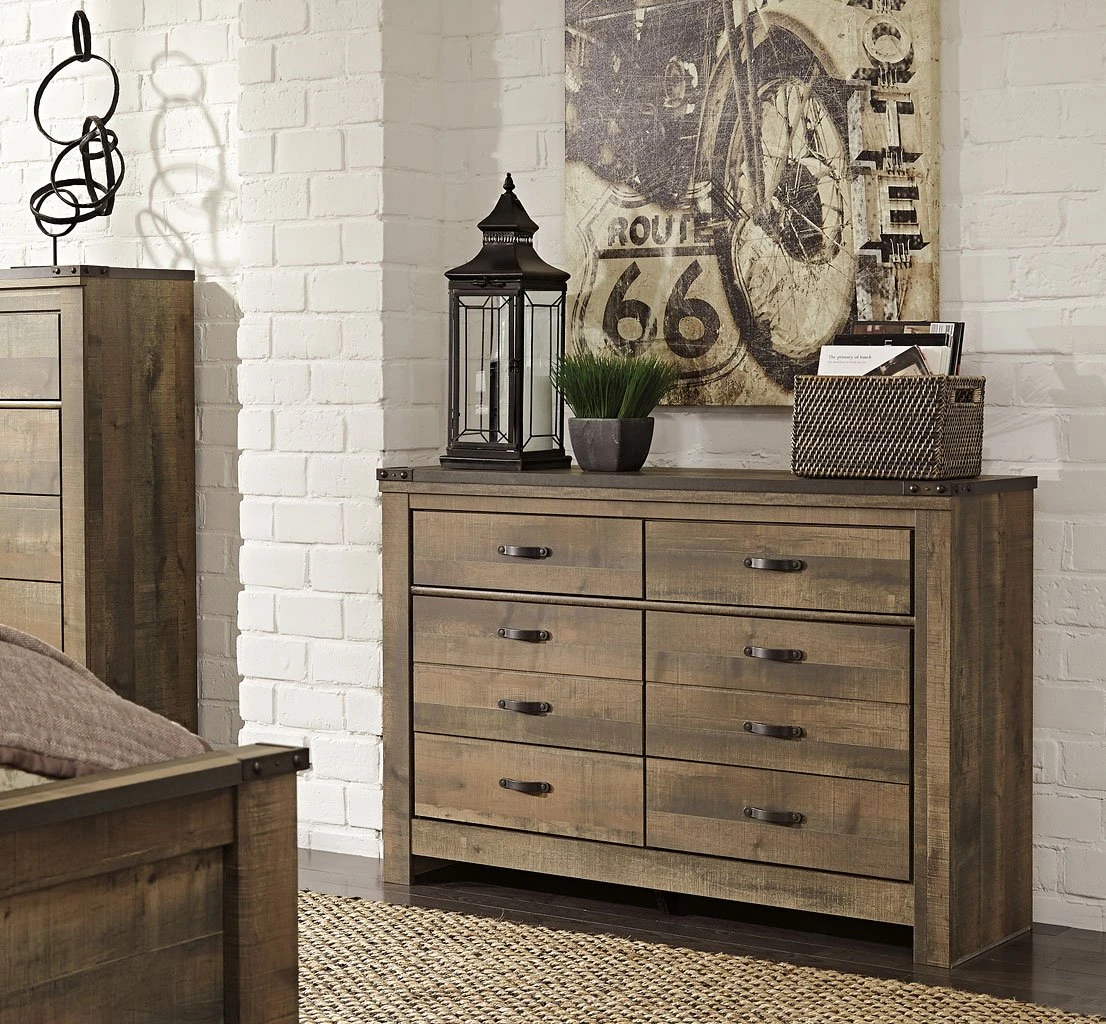 - OverviewWhether she loves horses or he’s a cowboy at heart, Trinell 6-drawer Dresser by Signature Design matches their authentic sense of style. Rustic finish, plank details and nailhead trim are an homage to reclaimed barn wood, making for a sophisticated, vintage-chic look. The roomy drawers keep clothing or toys nicely reined in.
