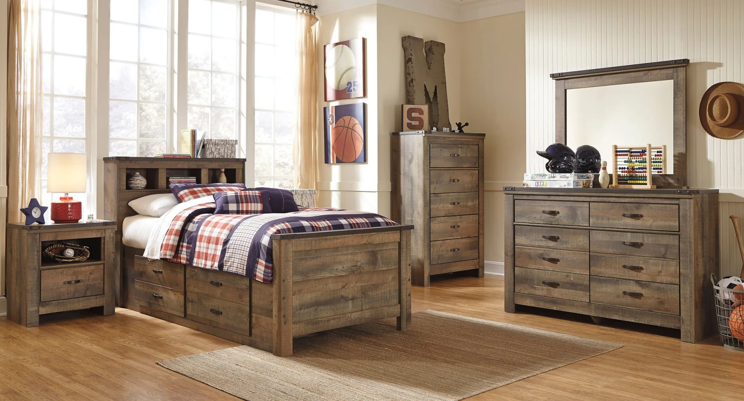 - OverviewWhether she loves horses or he’s a cowboy at heart, Trinell Youth Bookcase Bedroom Set by Signature Design matches their authentic sense of style. Rustic finish, plank details and nailhead trim are an homage to reclaimed barn wood, making for a sophisticated, vintage-chic look. The roomy drawers keep clothing or toys nicely reined in.