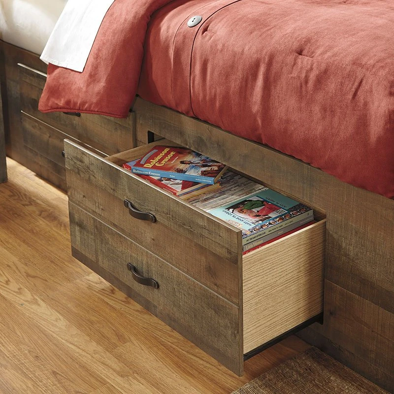 - OverviewWhether she loves horses or he’s a cowboy at heart, Trinell Youth Storage Bed by Signature Design matches their authentic sense of style. Rustic finish, plank details and nailhead trim are an homage to reclaimed barn wood, making for a sophisticated, vintage-chic look. The roomy drawers keep clothing or toys nicely reined in.